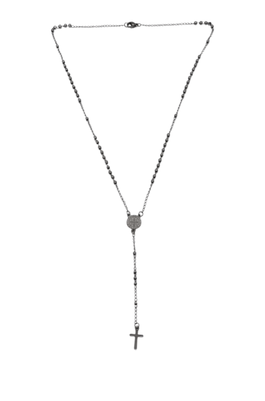Incluye medalla de San Benito con la tradicional cruz y simbología característica, además de cruz colgante a tono, formando un diseño sobrio y significativo.