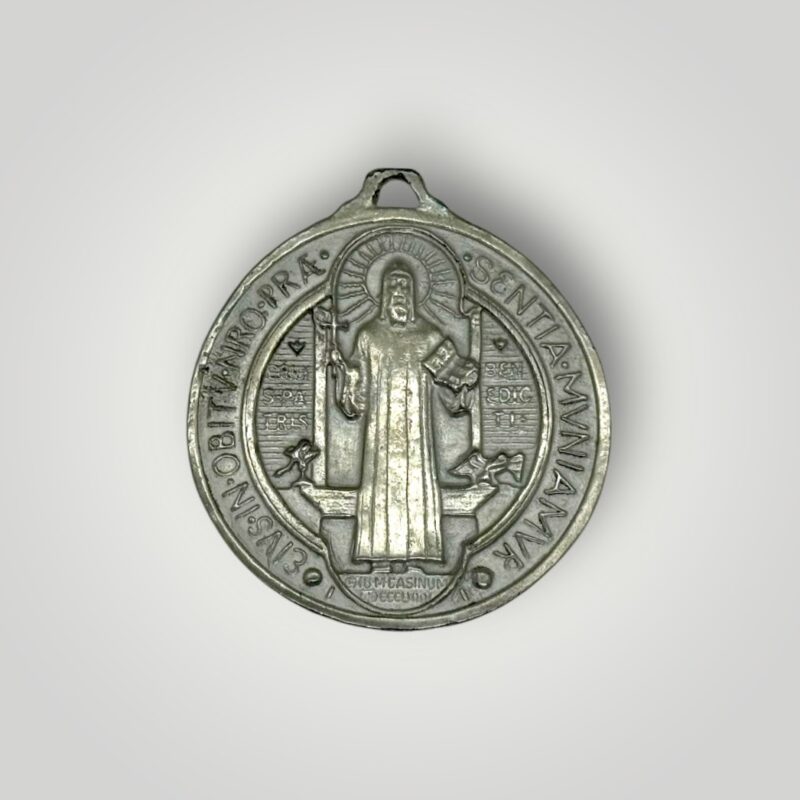 Medalla religiosa de San Benito, símbolo tradicional de protección y fe cristiana.