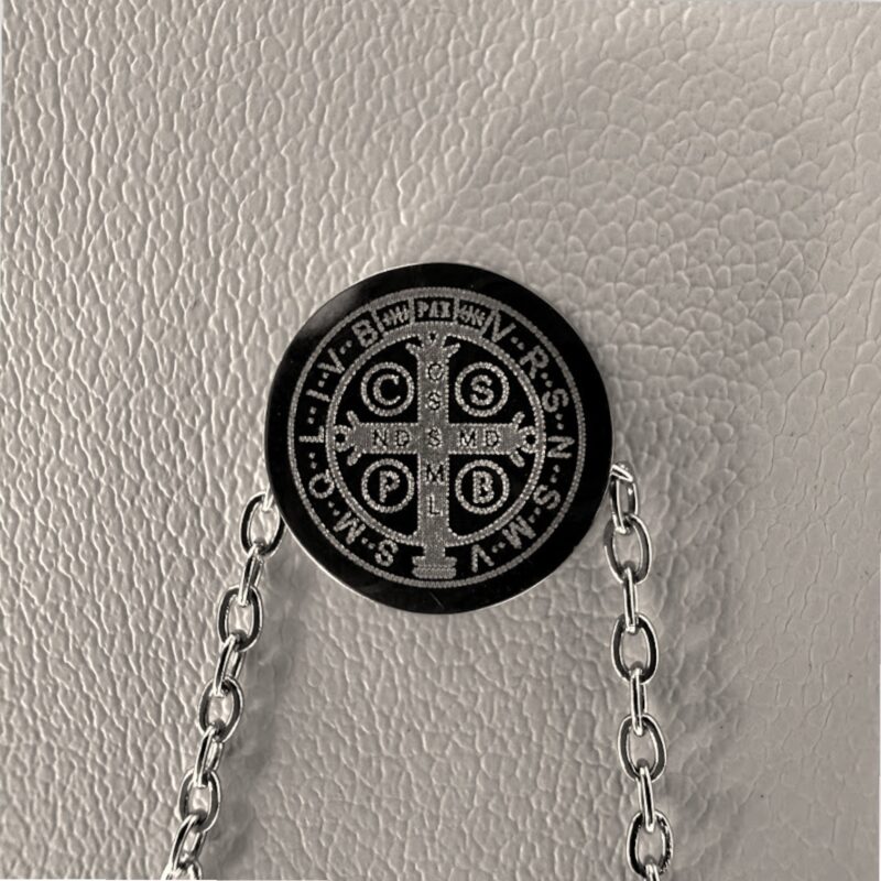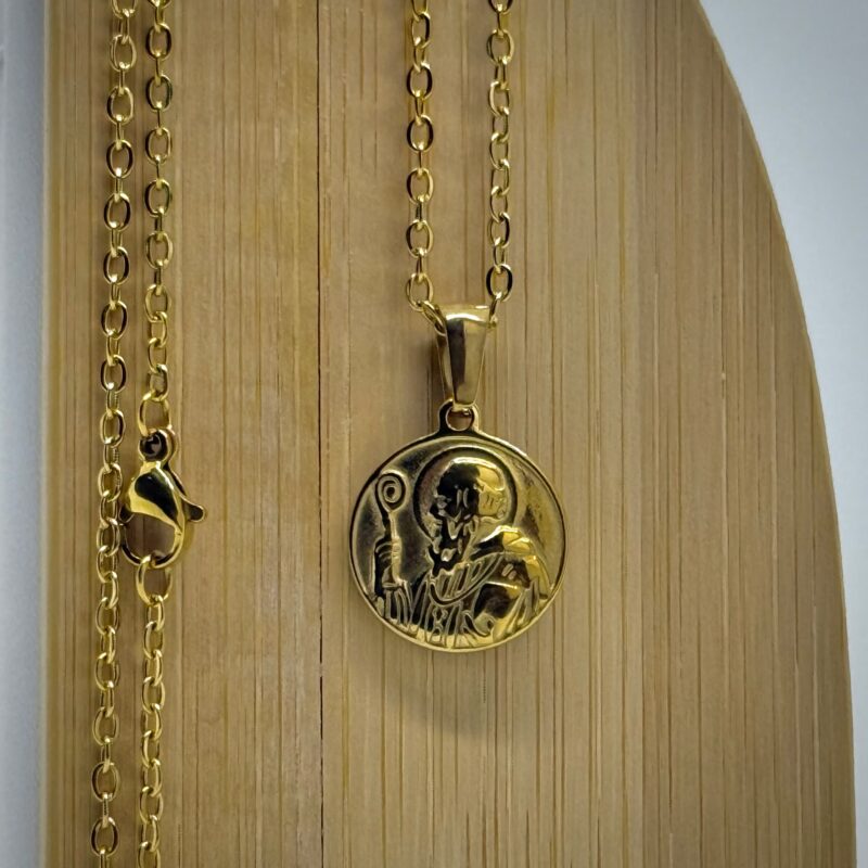 Conjunto de cadena rolo fina, acompañada de una medalla de San Benito con un relieve clásico que realza cada detalle. En el frente se aprecia la clásica cruz con inscripciones, mientras que en el reverso cuenta con la imagen de San Benito de perfil.