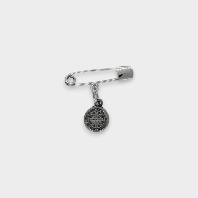 Es una pieza que abraza la tradición de proteger a los que más queremos, recordándonos que la fe nos acompaña en cada pequeño gesto y en cada lugar donde nos encontremos.Este delicado prendedor tipo alfiler de gancho está realizado íntegramente en plata 925. El conjunto incluye una pequeña medalla de San Benito colgante con detalles definidos; su uso es ideal para colocar en la ropa o en el interior de un bolso, siendo un regalo clásico ideal para acompañar y proteger desde los primeros momentos.