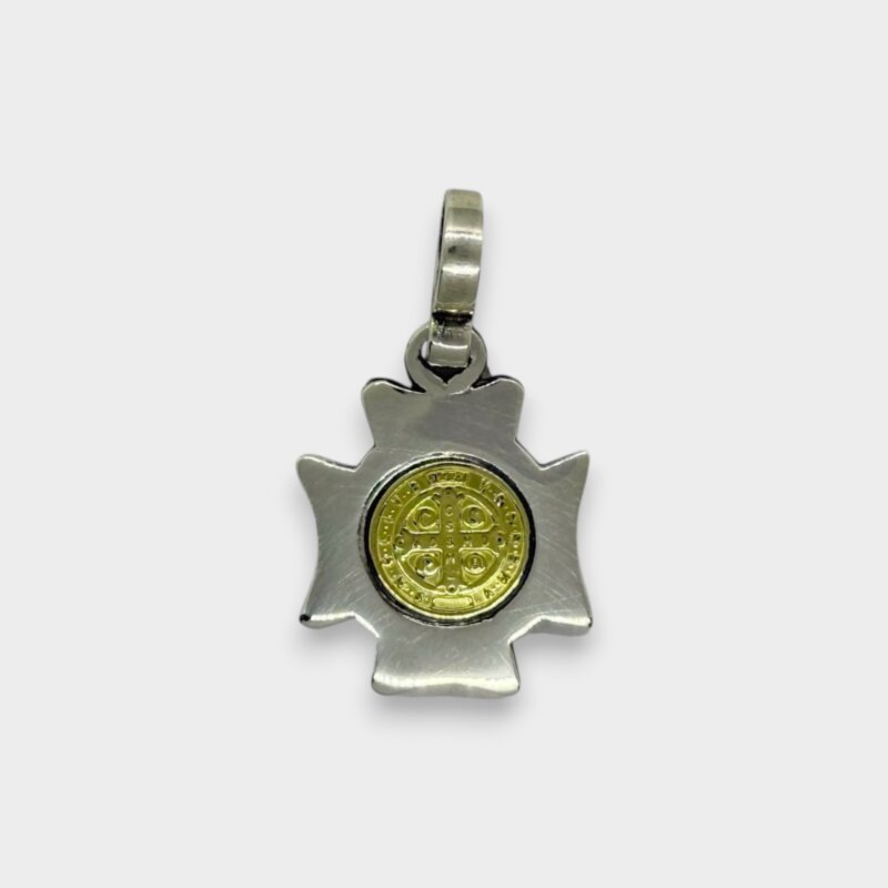 La combinación de la Cruz de Malta con la Medalla de San Benito une dos potentes símbolos de la tradición cristiana. La Cruz de Malta, con sus ocho puntas, representa las bienaventuranzas y el compromiso del caballero de la fe, mientras que San Benito nos ofrece su protección contra toda adversidad.Esta exclusiva medalla con forma de Cruz de Malta está fabricada en plata 925 de alta calidad, con un centro destacado en dublé de oro que resalta la Cruz de San Benito en el frente. El diseño incluye la figura del Santo en el dorso.