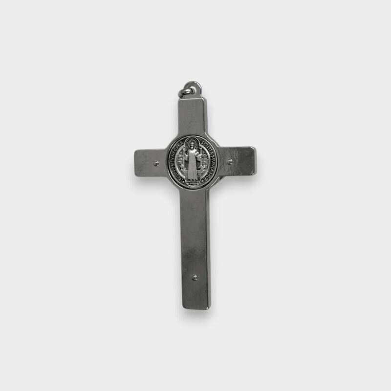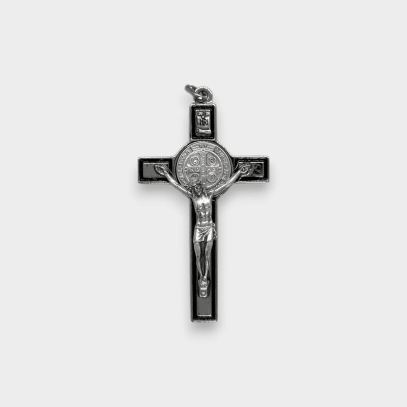 Crucifijo que incorpora la Medalla de San BenitoLa Cruz, símbolo del sacrificio y amor infinito de Jesús, se une a la intercesión del Santo Padre de los monjes. El diseño presenta un distinguido borde en color negro que resalta la figura de Cristo y la medalla central grabada con precisión, mientras que el dorso exhibe la figura del Santo en cuerpo completo