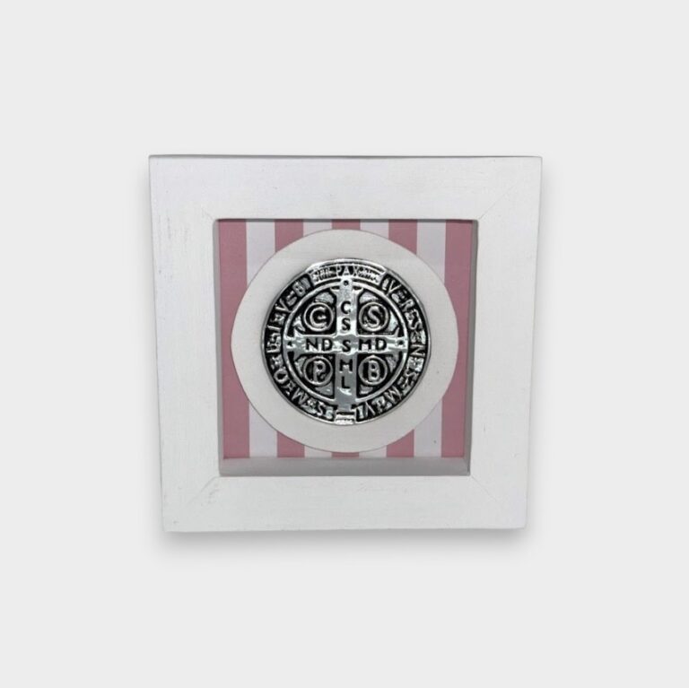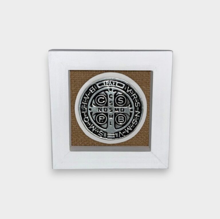Cuadro decorativo con medalla de San Benito en relieve, elaborada en metal tono plateado con detalles en negro que realzan sus inscripciones tradicionales.