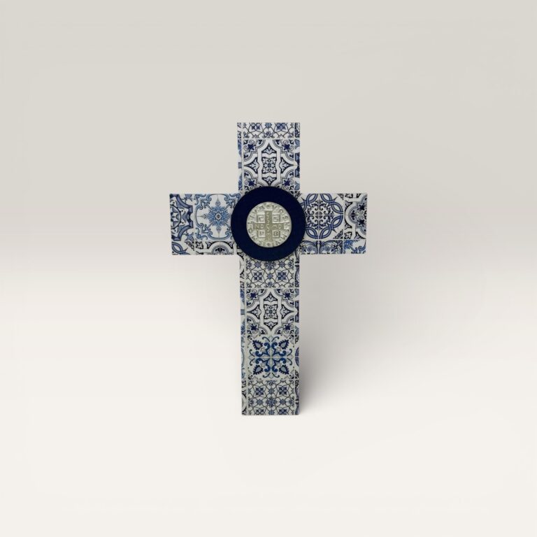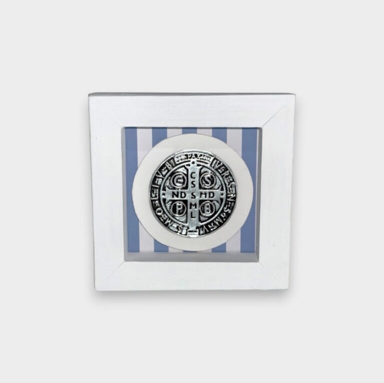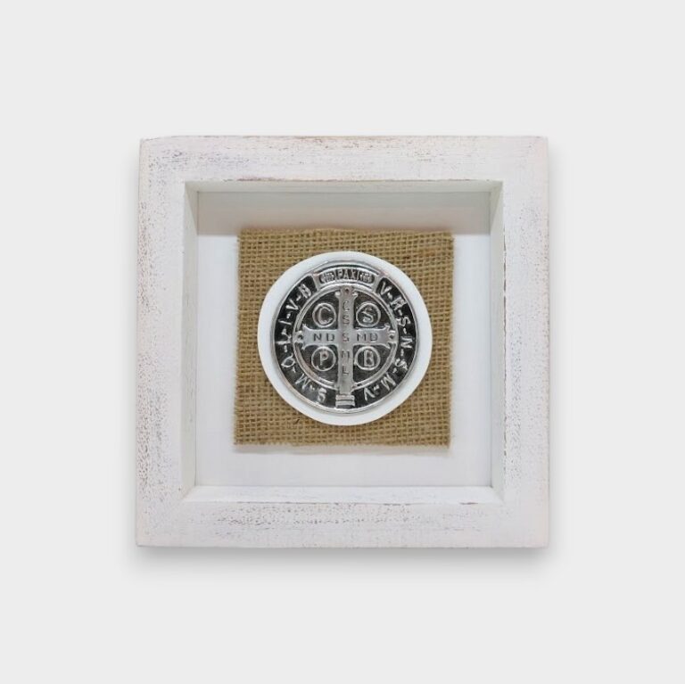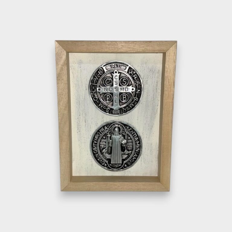 Cuadro decorativo con medalla de San Benito en relieve, elaborada en metal tono plateado con detalles en negro que realzan sus inscripciones tradicionales.