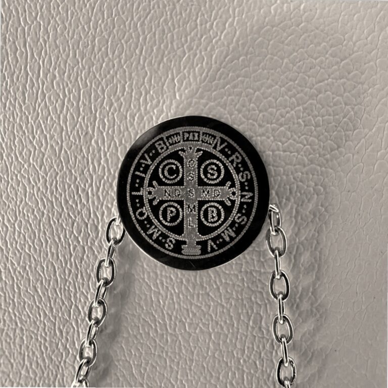 Conjunto de cadena rolo gruesa de 50 cm de largo, acompañada de una medalla de San Benito con un diseño distintivo en relieve tipo “gota” en tono negro, que realza cada detalle.