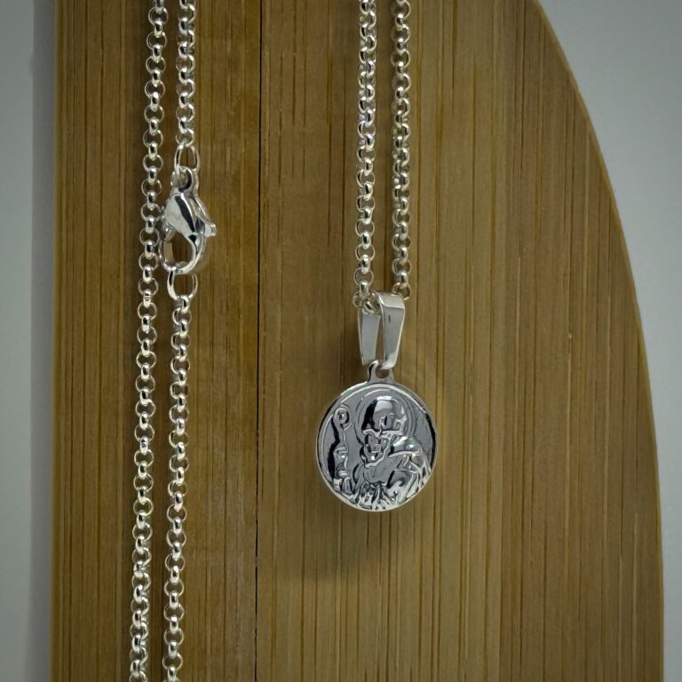 Conjunto de cadena rolo fina, acompañada de una medalla de San Benito con un relieve clásico que realza cada detalle. En el frente se aprecia la clásica cruz con inscripciones, mientras que en el reverso cuenta con la imagen de San Benito de perfil.