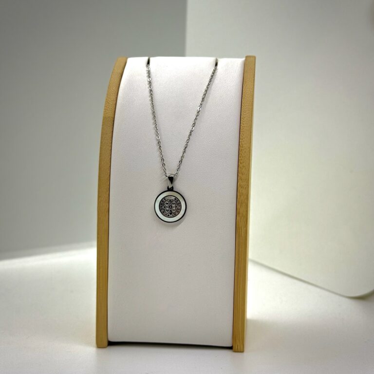 Gargantilla de acero con cadena ajustable, ideal para adaptarse cómodamente a distintos largos. Lleva una delicada medalla de San Benito con detalle en nácar, que le aporta un brillo suave y elegante.