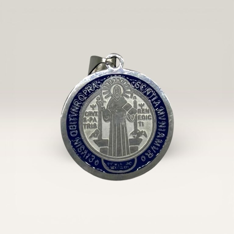 Medalla confeccionada en plata 925, con delicado trabajo esmaltado en tonos azul profundo que realza los detalles de la tradicional Cruz de San Benito. Pieza fina y elegante, ideal para uso diario o como regalo.