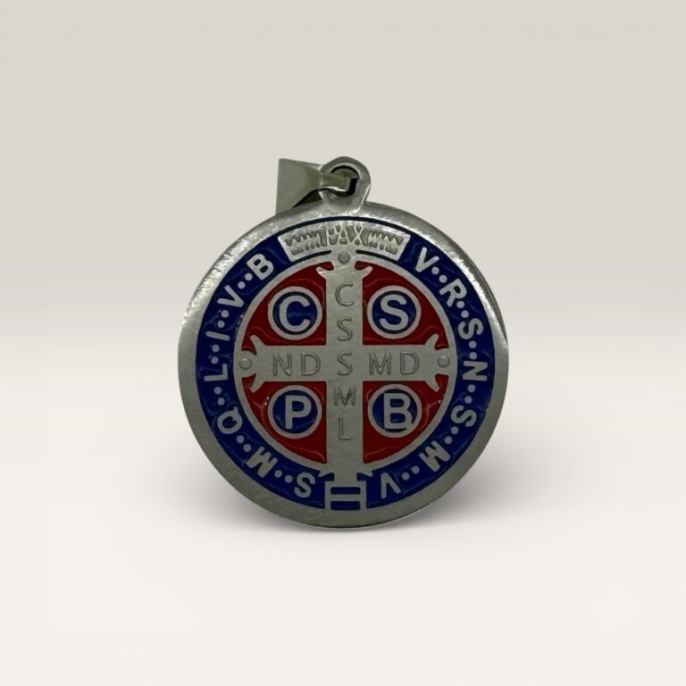 Presenta esmalte en rojo y azul, que realza la tradicional Cruz de San Benito y le aporta un acabado moderno y llamativo.