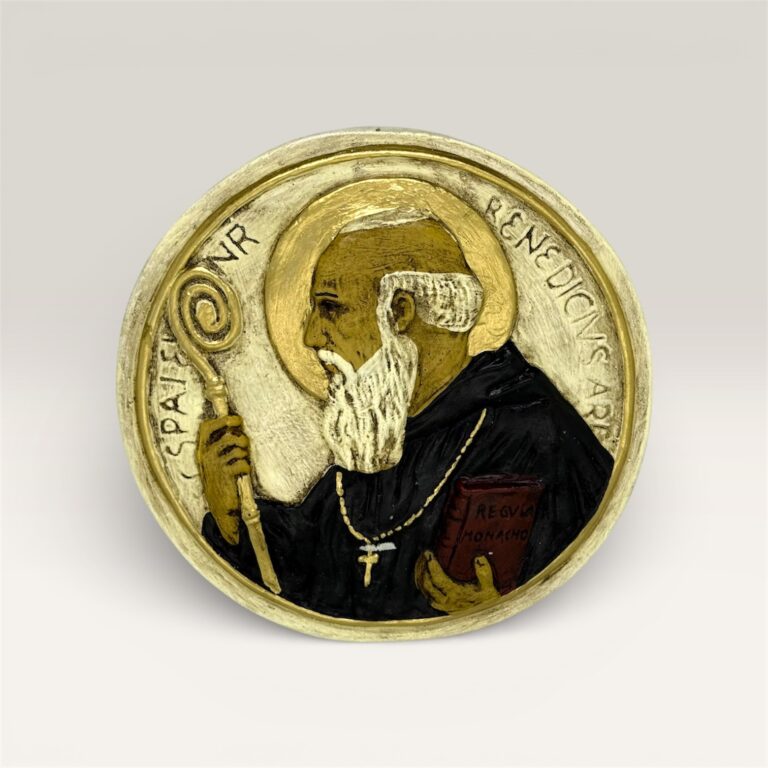 Medallón religioso realizado en yeso, pintado y terminado a mano. Representa a San Benito de perfil, con detalles cuidadosamente trabajados y acabado en tonos cálidos y dorados que realzan la imagen.