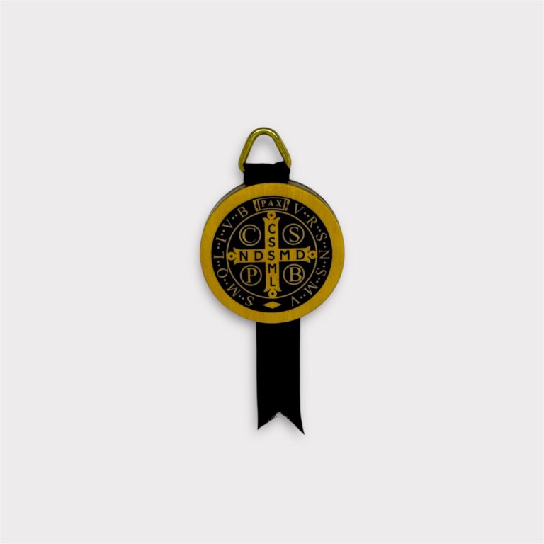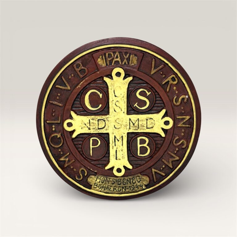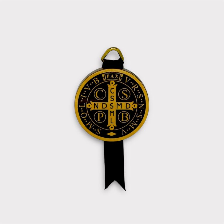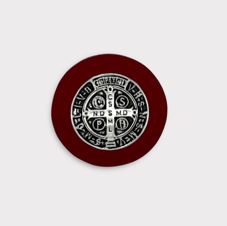 Medallón decorativo confeccionado en madera pintada a mano, con detalle central en aluminio repujado con la tradicional imagen de la Medalla de San Benito.