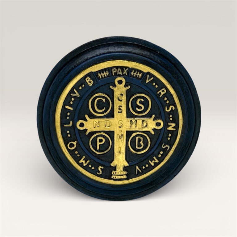 Medallón de San Benito, realizado en yeso y elaborado artesanalmente por un artista nacional especializado en arte sacro.