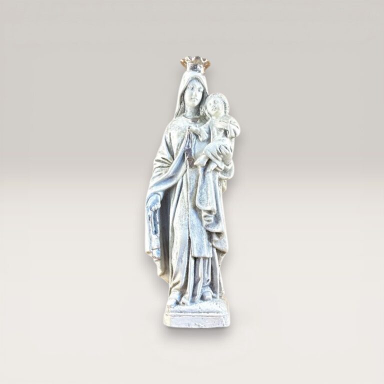 La Virgen del Carmen, es una de las advocaciones marianas más universales, celebrada cada 16 de julio. Su origen se remonta al Monte Carmelo en el siglo XII, siendo patrona de la Orden Carmelita, los marineros, pescadores y considerada "Estrella del Mar".Esta pieza es una obra de arte sacro de fabricación nacional, elaborada por un artista especializado en arte sacro. Está realizada en cemento, lo que la hace una opción apta para exterior, ideal para colocar en grutas, jardines o altares al aire libre. La imagen tiene una altura de 30 cm y presenta un acabado artesanal que resalta los detalles de la Virgen y el Niño Jesús.