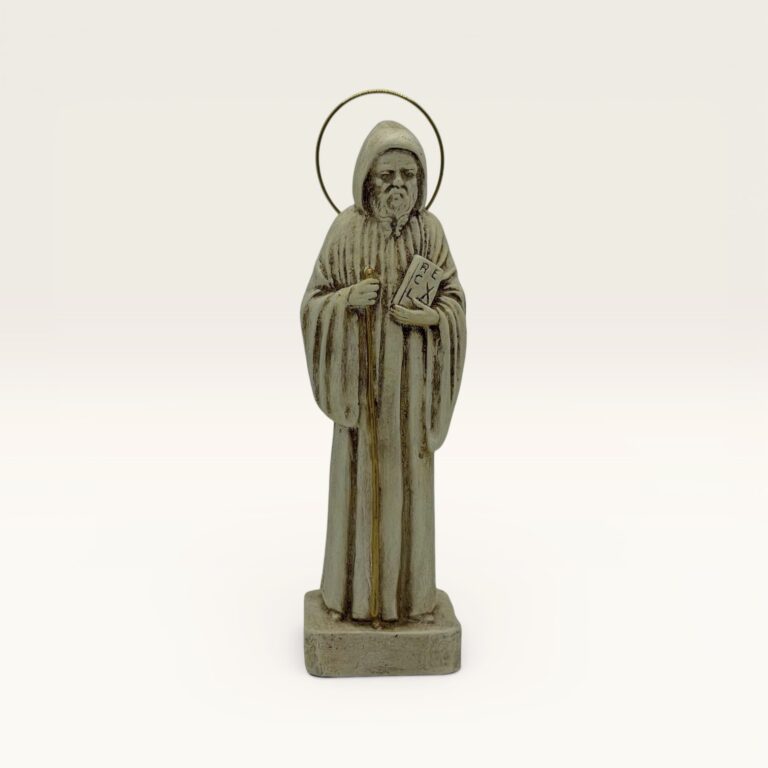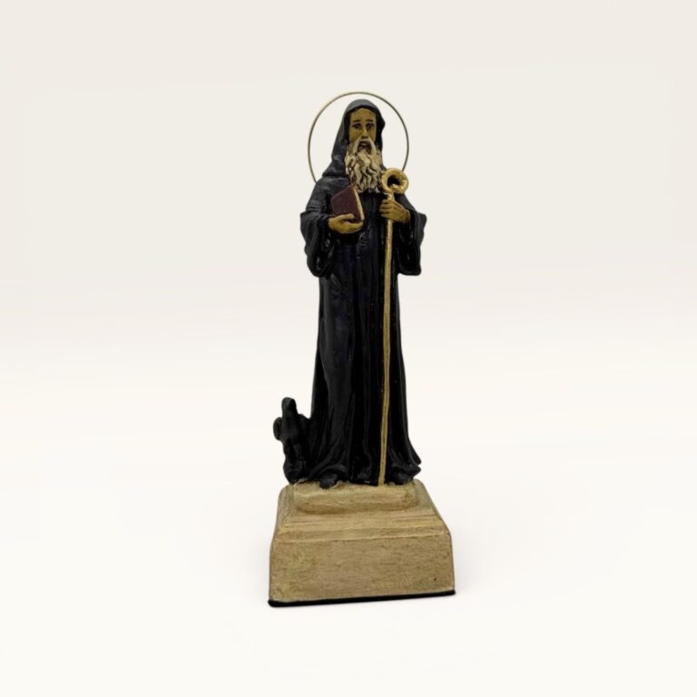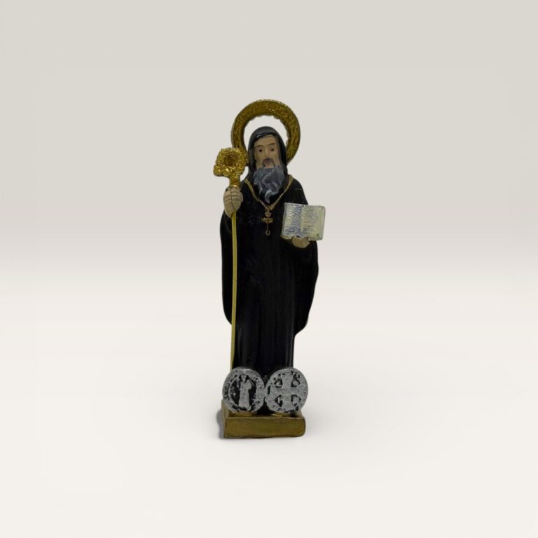 Clásica imagen de San Benito, representado con su hábito monástico, el libro de la regla y el báculo pastoral, símbolos de su vida espiritual y su guía en la fe. Es una figura muy venerada por su protección.