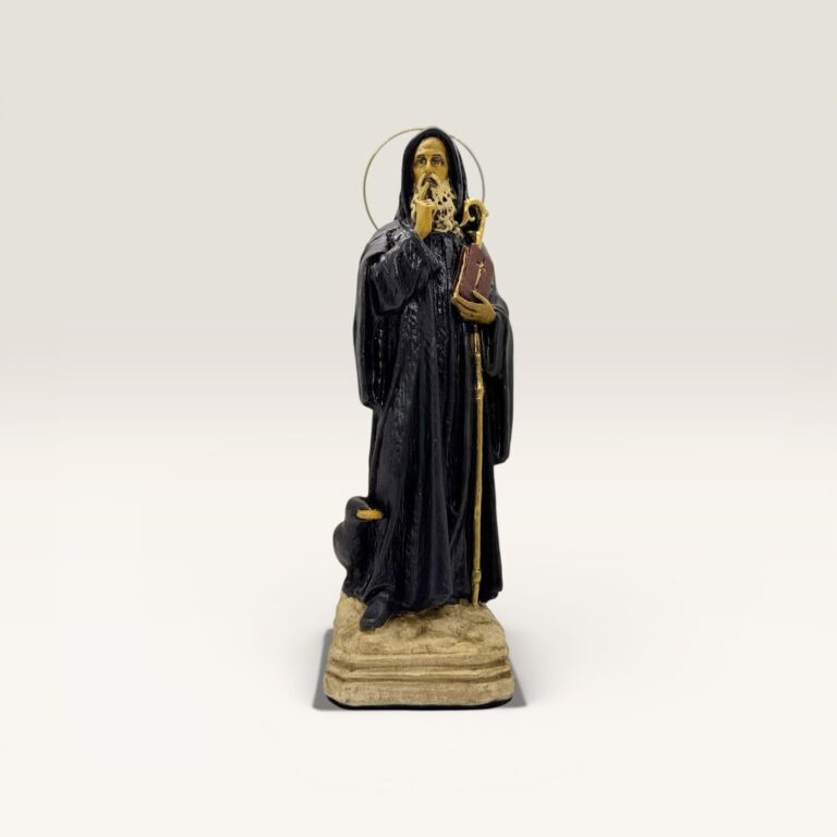 Clásica imagen de San Benito, representado con su hábito monástico, el libro de la regla y el báculo pastoral, símbolos de su vida espiritual y su guía en la fe. Es una figura muy venerada por su protección.