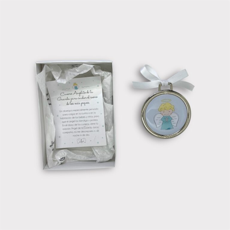 Delicado cunero circular confeccionado en metal plateado, con ilustración central del Ángel de la Guarda en tonos suaves. Incluye cinta de raso blanca para colgar fácilmente en la cuna, moisés o pared.