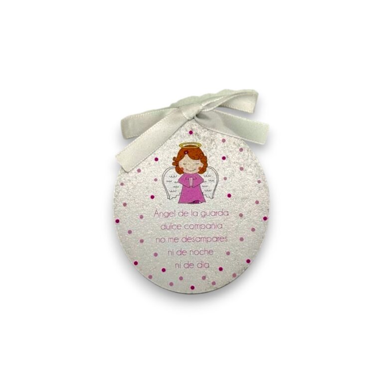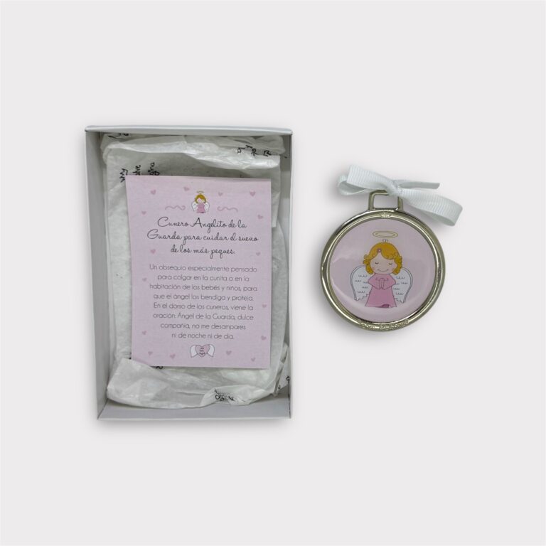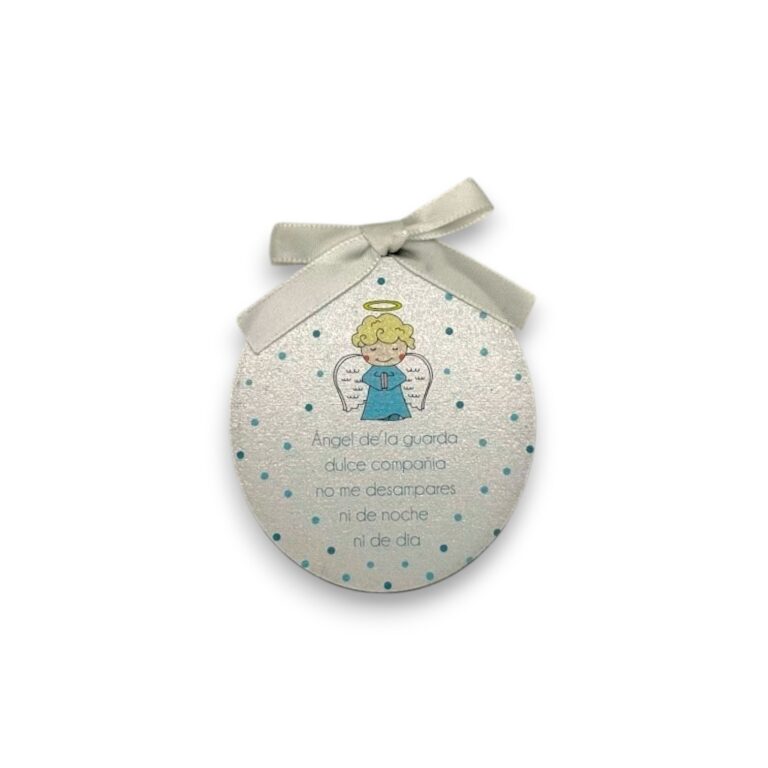 Delicado cunero circular confeccionado en metal plateado, con ilustración central del Ángel de la Guarda en tonos suaves. Incluye cinta de raso blanca para colgar fácilmente en la cuna, moisés o pared.