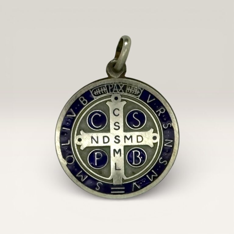 Medalla confeccionada en plata 925, con delicado trabajo esmaltado en tonos azul profundo que realza los detalles de la tradicional Cruz de San Benito. Pieza fina y elegante, ideal para uso diario o como regalo con significado espiritual.