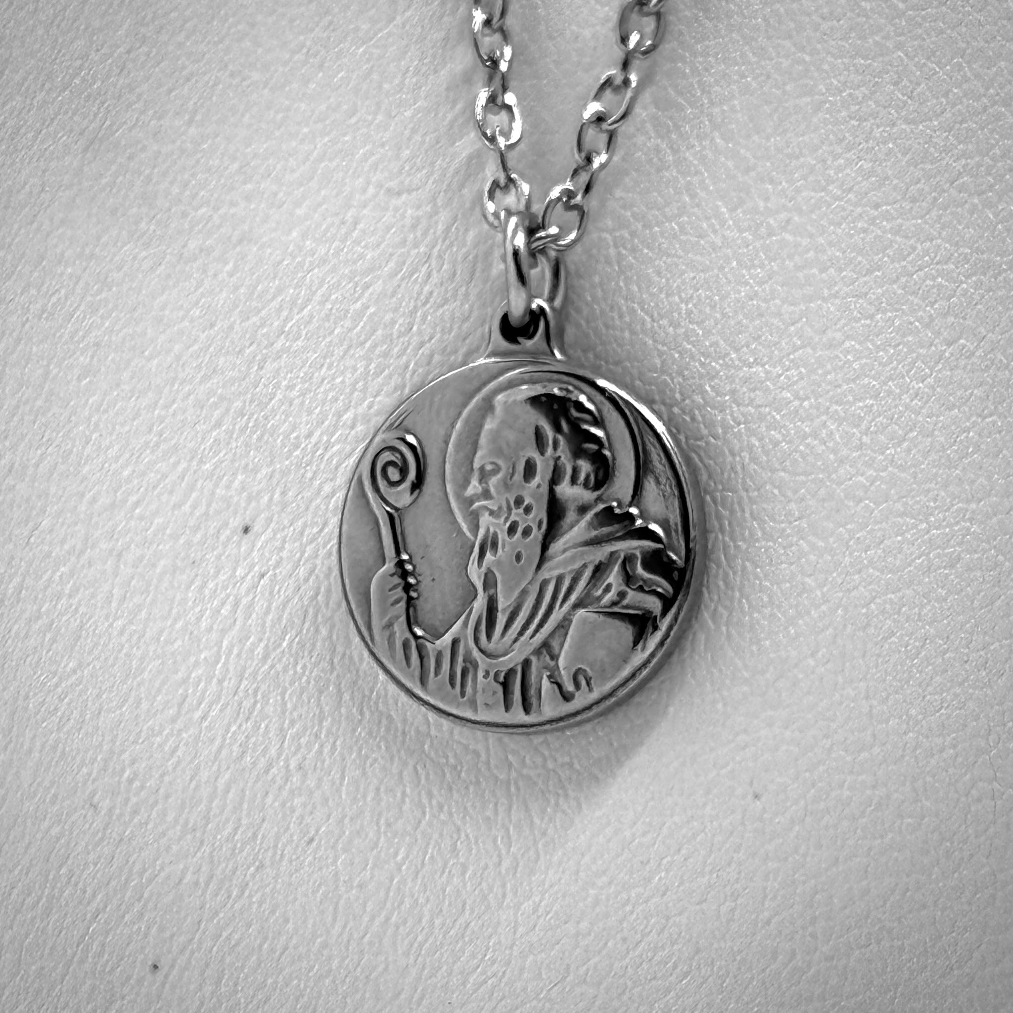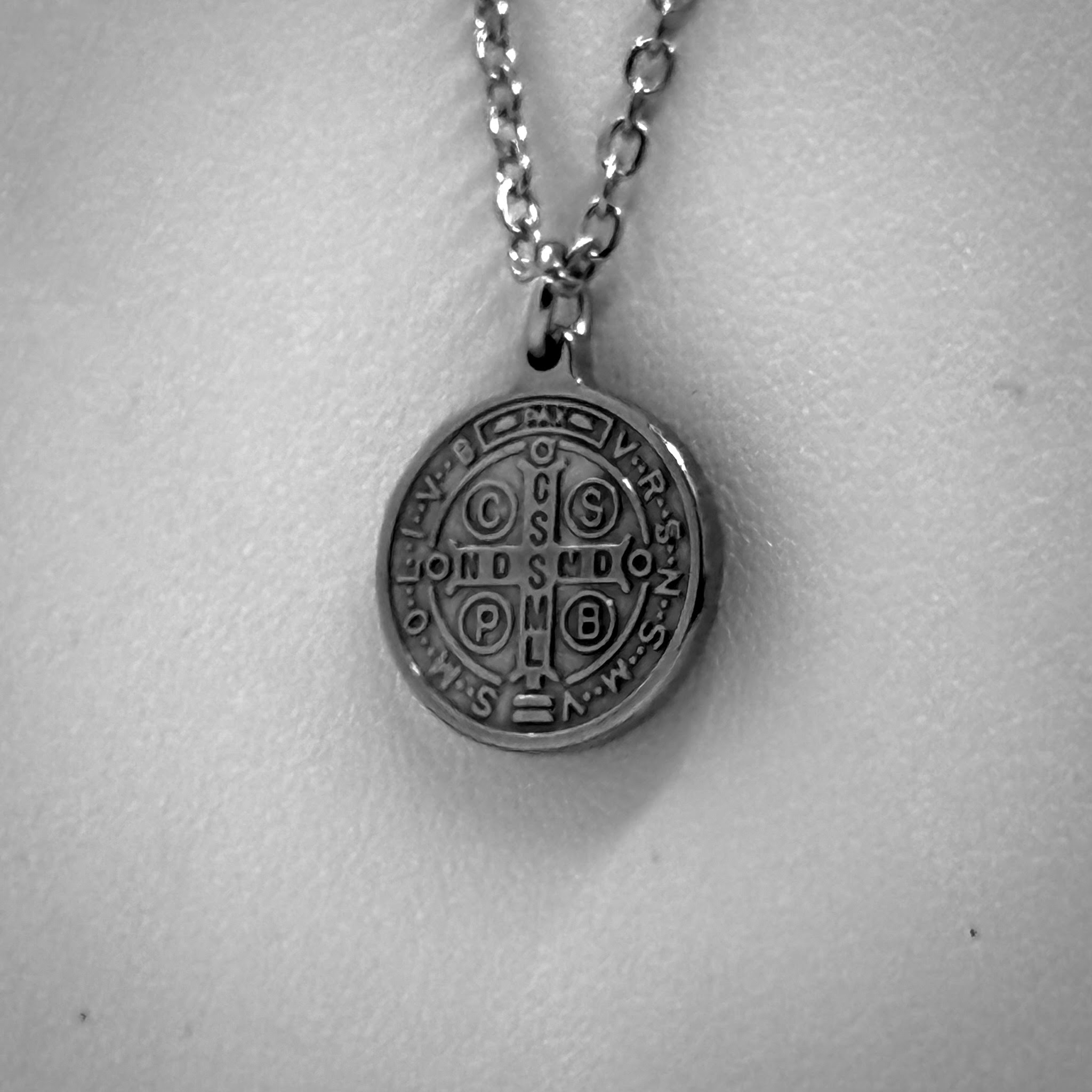 Este conjunto está íntegramente fabricado en acero quirúrgico, lo que asegura una pieza totalmente hipoalergénica, resistente al agua y que mantiene su brillo plateado original sin oscurecerse con el tiempo. El diseño incluye una medalla circular con la representación de la Medalla de San Benito y su respectiva imagen en relieve, acompañada de una cadena de 50 cm de largo.