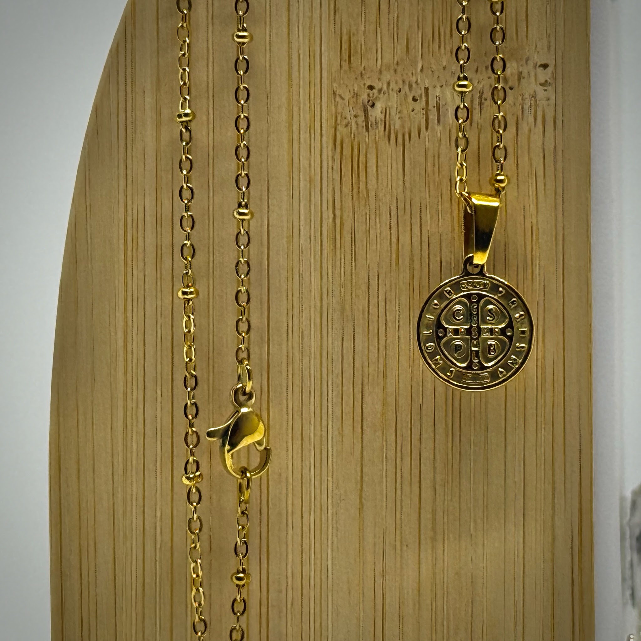 Conjunto de cadena rolo fina, acompañada de una medalla de San Benito con un relieve clásico que realza cada detalle. En el frente se aprecia la clásica cruz con inscripciones, mientras que en el reverso cuenta con la imagen de San Benito de perfil.