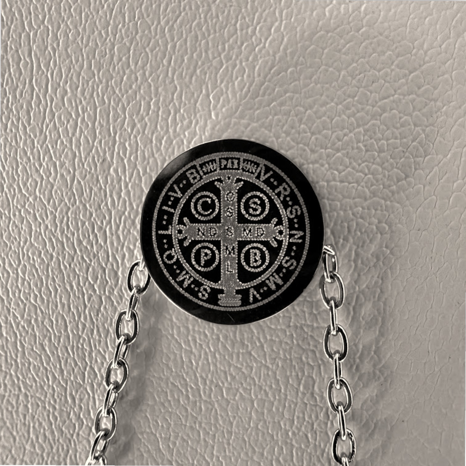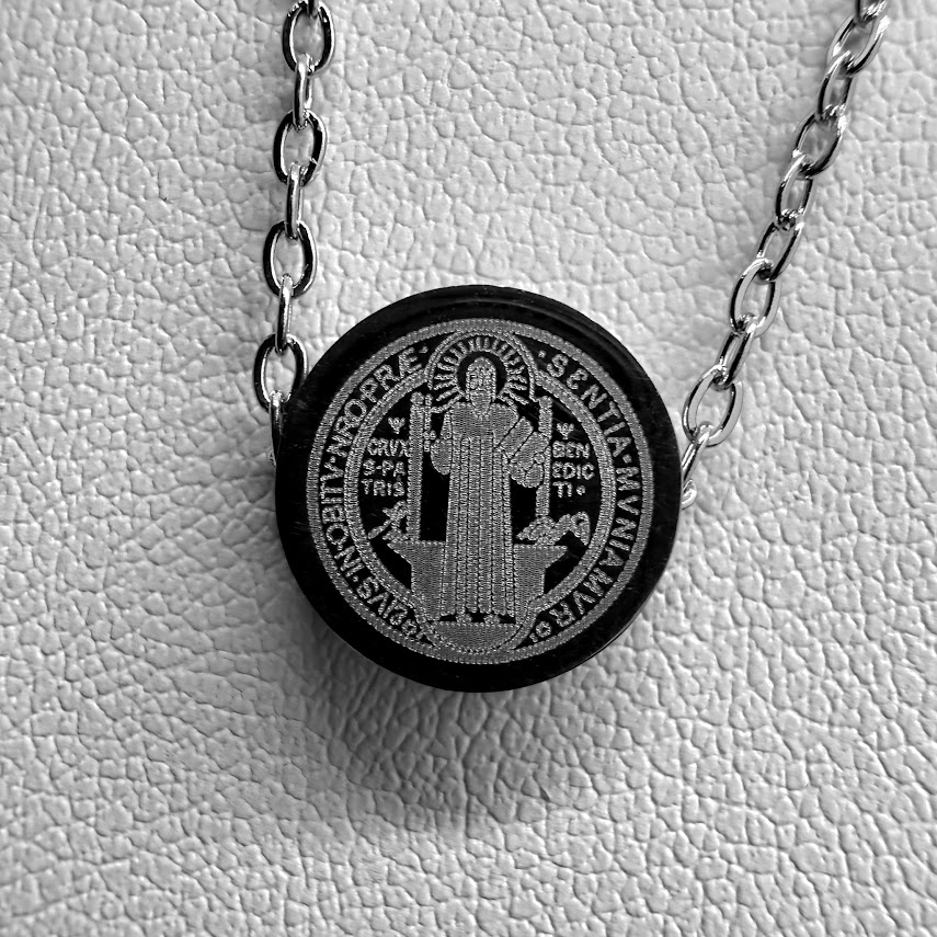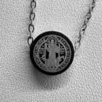 Este conjunto está íntegramente fabricado en acero quirúrgico, lo que asegura una pieza totalmente hipoalergénica, resistente al agua y que mantiene su brillo plateado original sin oscurecerse con el tiempo. El diseño incluye una medalla circular con la representación de la Medalla de San Benito y su respectiva imagen grabada en láser, acompañada de una cadena de 50 cm de largo.