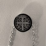 - En la parte inferior, el medallón con la imagen de San Benito y sus inscripciones características.