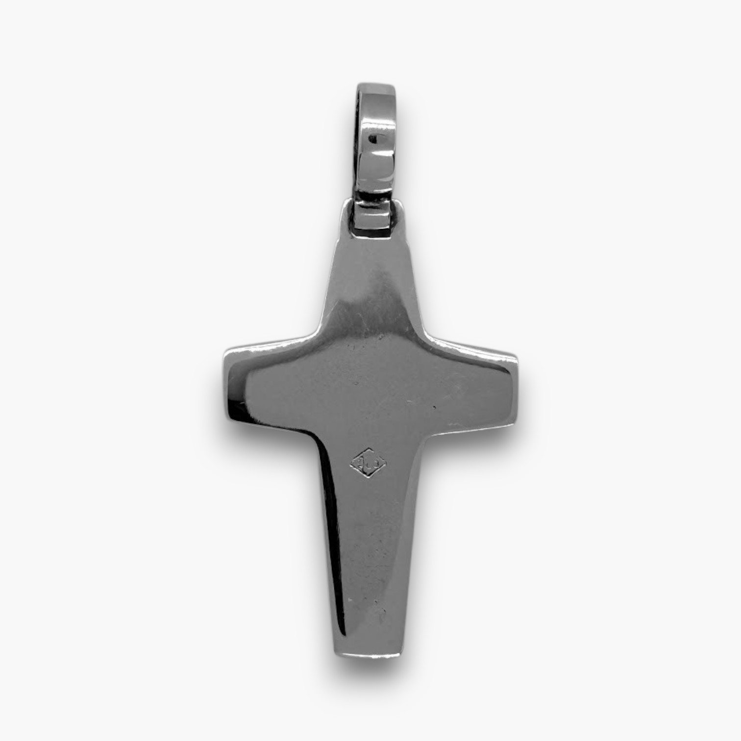 Cruz con imagen del Buen pastor, elaborado en plata 925 rodinada, con muy buena terminación que permite apreciar cada relieve con claridad.