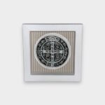 Cuadro decorativo con medalla de San Benito en relieve, elaborada en metal tono plateado con detalles en negro que realzan sus inscripciones tradicionales.