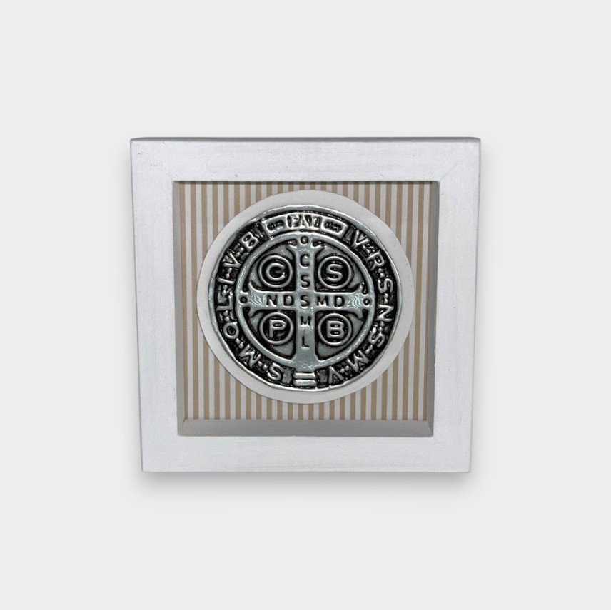 Cuadro decorativo con medalla de San Benito en relieve, elaborada en metal tono plateado con detalles en negro que realzan sus inscripciones tradicionales.