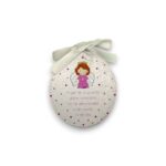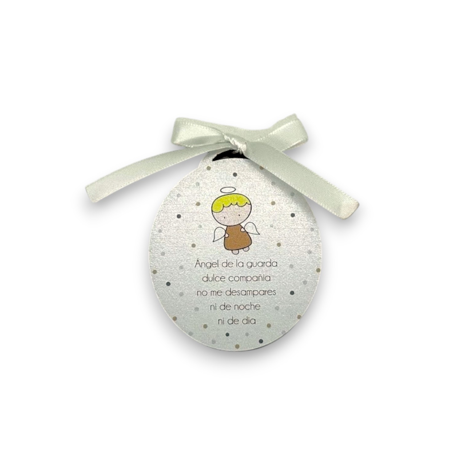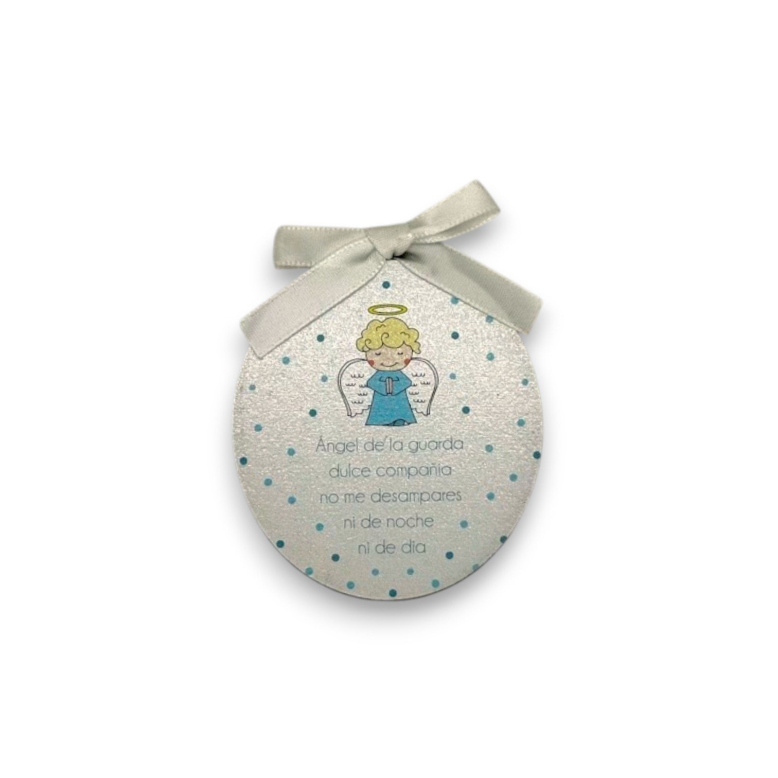 Delicado cunero circular en madera, con ilustración central del Ángel de la Guarda en tonos rosa, celeste y nude, acompañada con una clásica oración. Incluye cinta de raso blanca para colgar fácilmente en la cuna, moisés o pared.