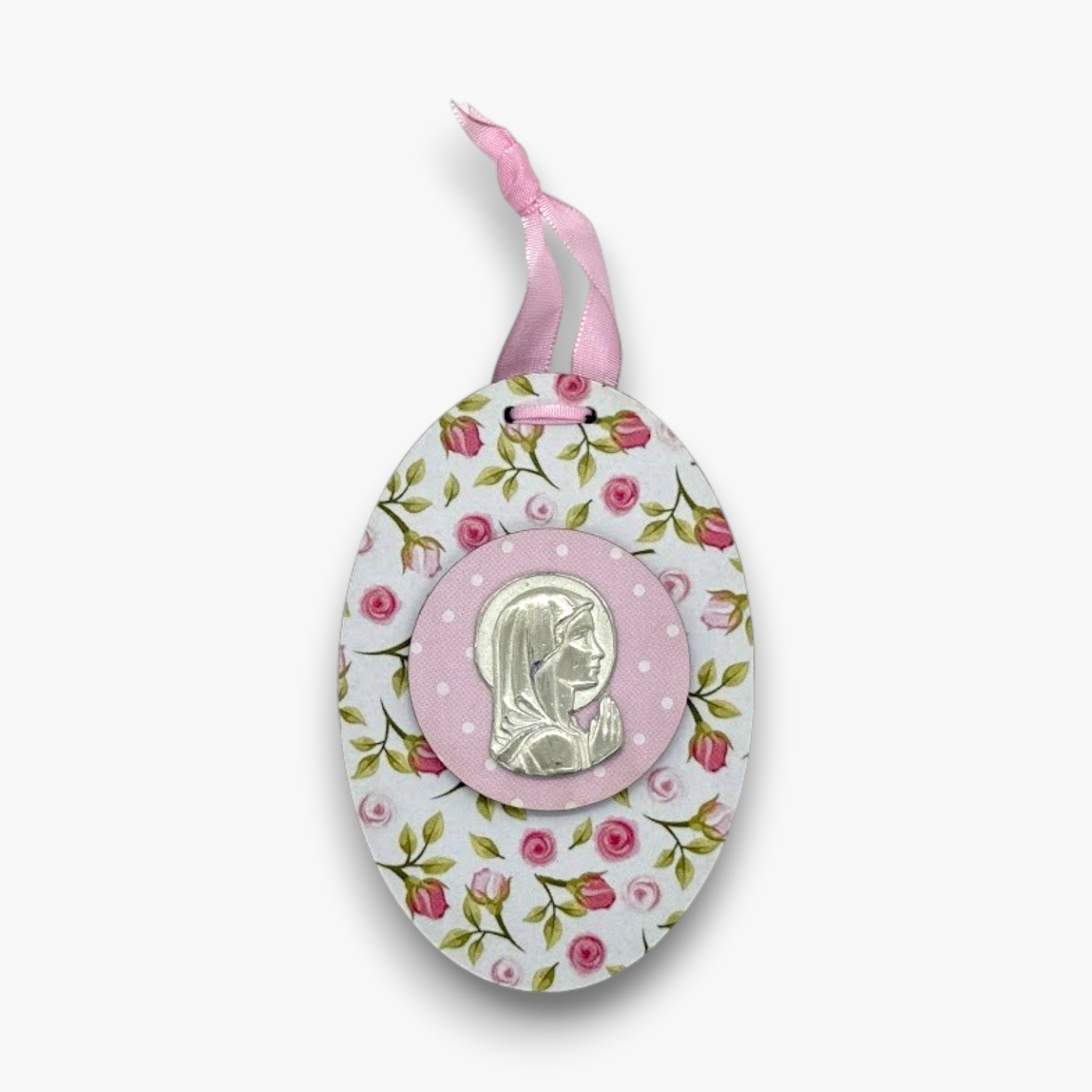 Cunero ovalado con medalla religiosa, ideal para acompañar y proteger desde los primeros momentos. Realizado en madera y metal, combina delicadeza y significado en una pieza especial.