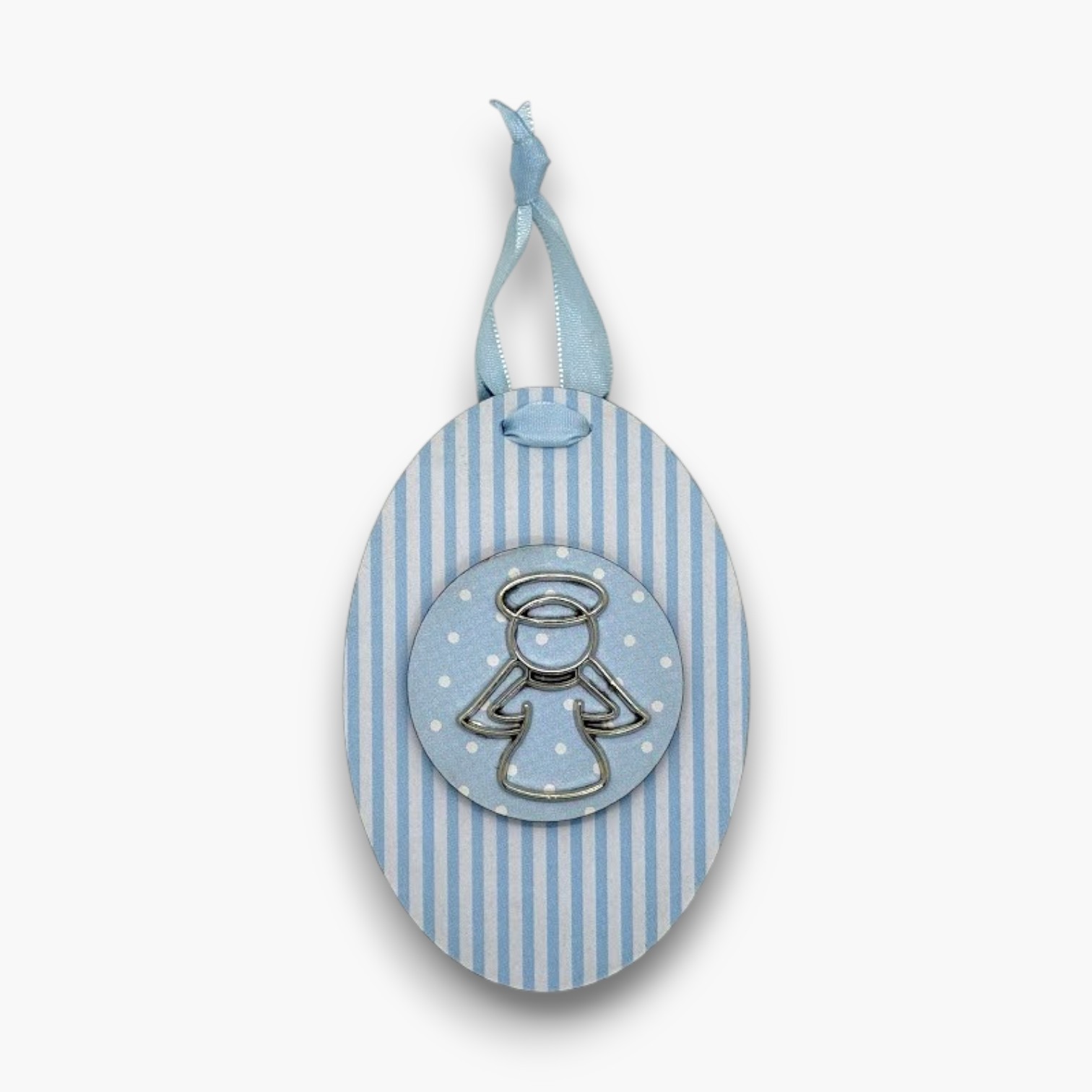 Disponible en tonos celeste y rosa, con detalles suaves y armoniosos que lo hacen perfecto para bebés. Incluye cinta para colgar, siendo ideal para la cuna. Un regalo lleno de fe y protección.
