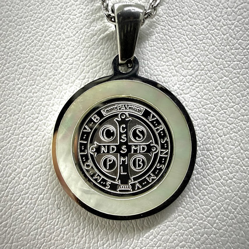 Gargantilla de acero con cadena ajustable, ideal para adaptarse cómodamente a distintos largos. Lleva una delicada medalla de San Benito con detalle en nácar, que le aporta un brillo suave y elegante.