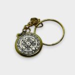 LLavero elaborado en metal común con diseño dorado. En el anverso se aprecia claramente la tradicional medalla con sus inscripciones bien definidas, mientras que en el reverso incluye la imagen de San Benito en cuerpo completo.