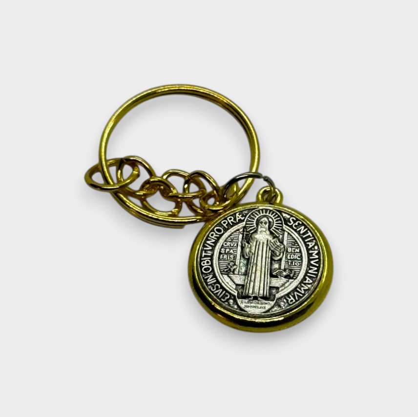 LLavero elaborado en metal común con diseño dorado. En el anverso se aprecia claramente la tradicional medalla con sus inscripciones bien definidas, mientras que en el reverso incluye la imagen de San Benito en cuerpo completo.
