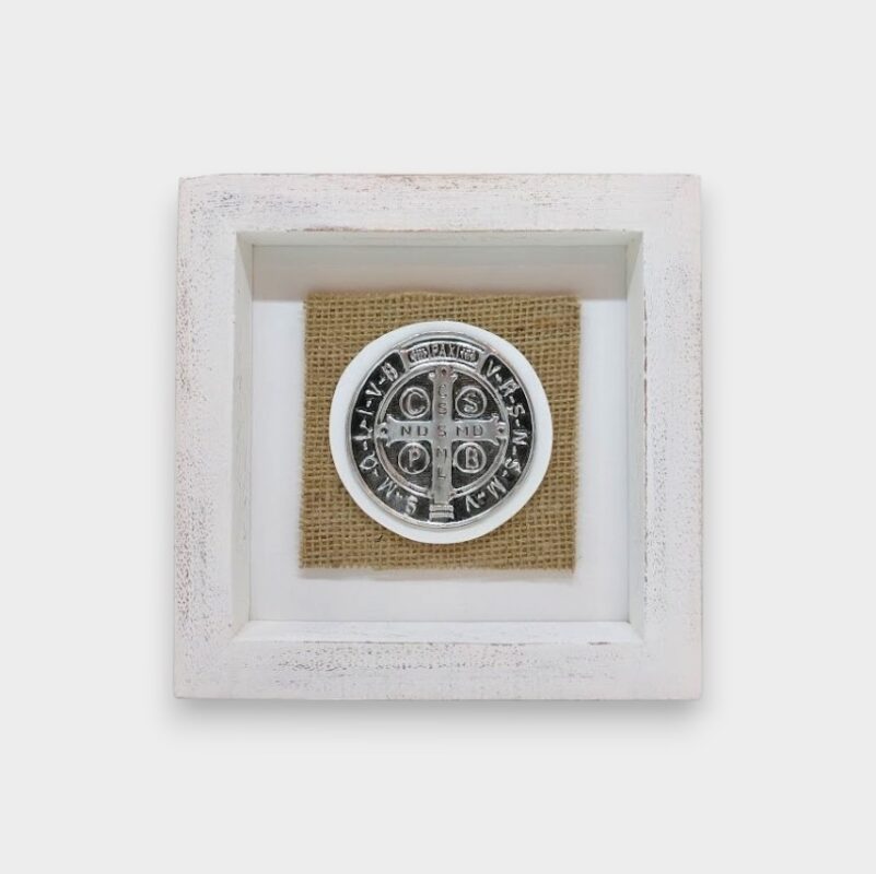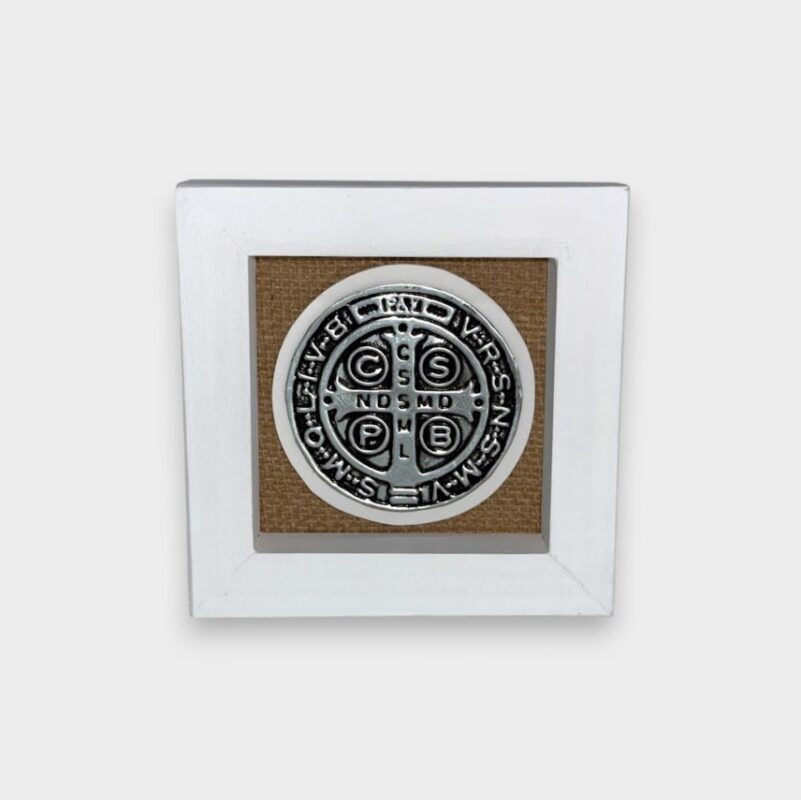 Medallón decorativo confeccionado en madera pintada a mano, con detalle central en aluminio repujado con la tradicional imagen de la Medalla de San Benito.