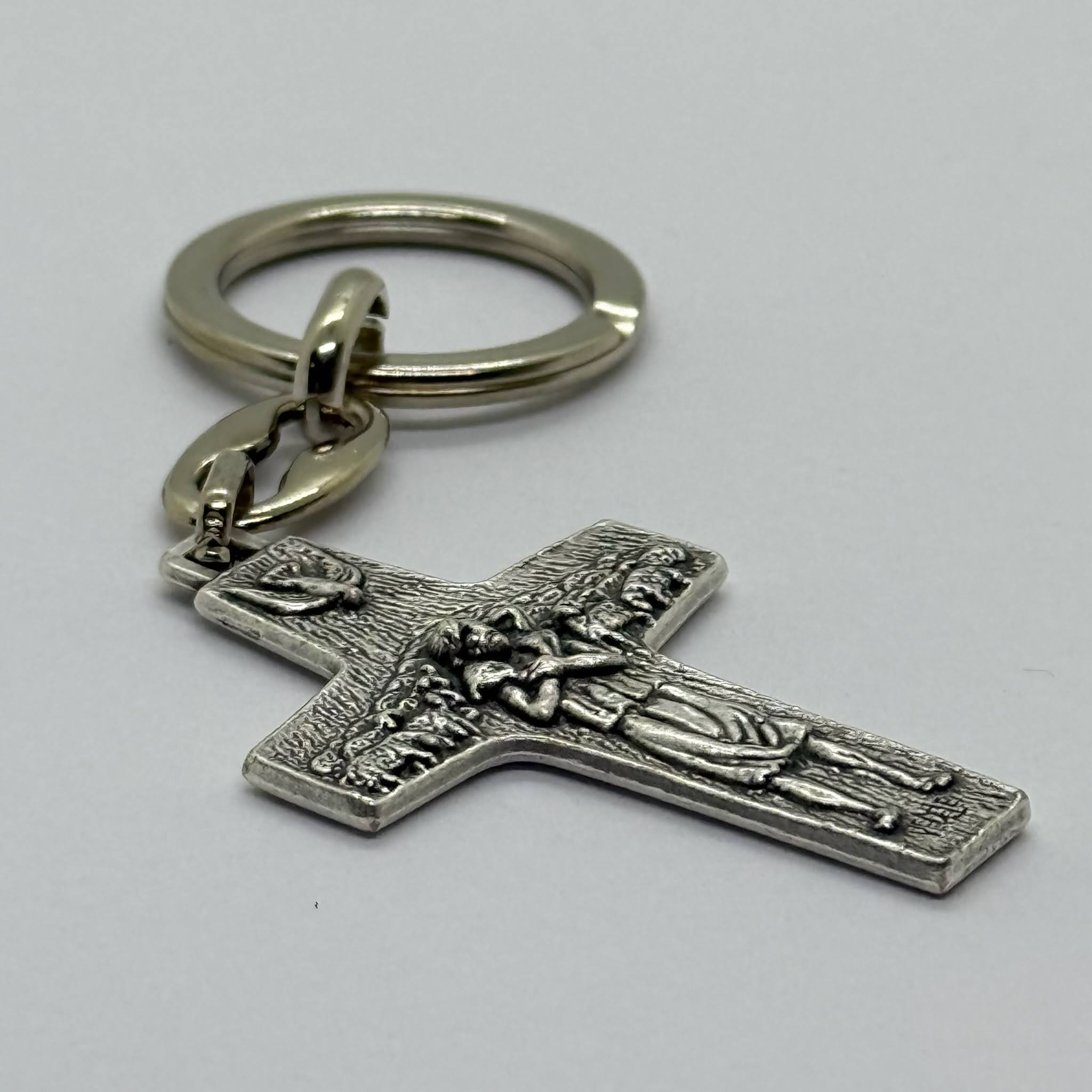 Llavero en forma de cruz con imagen del Buen Pastor, elaborado en metal común con muy buena terminación que permite apreciar cada relieve con claridad. Presenta una argolla y cadena resistentes, ideales para el uso diario, brindando firmeza y durabilidad.