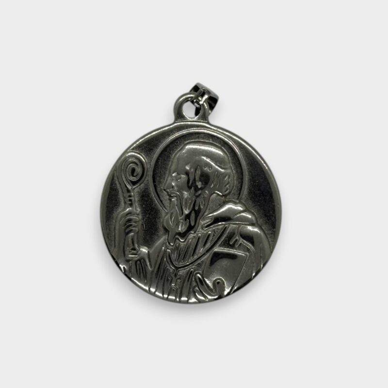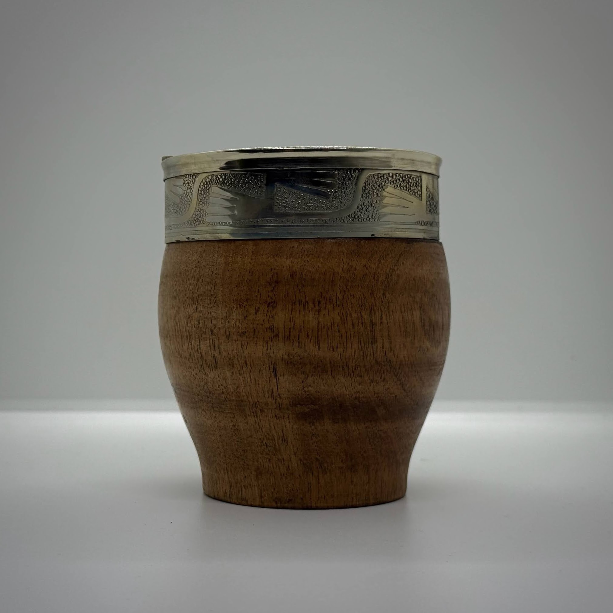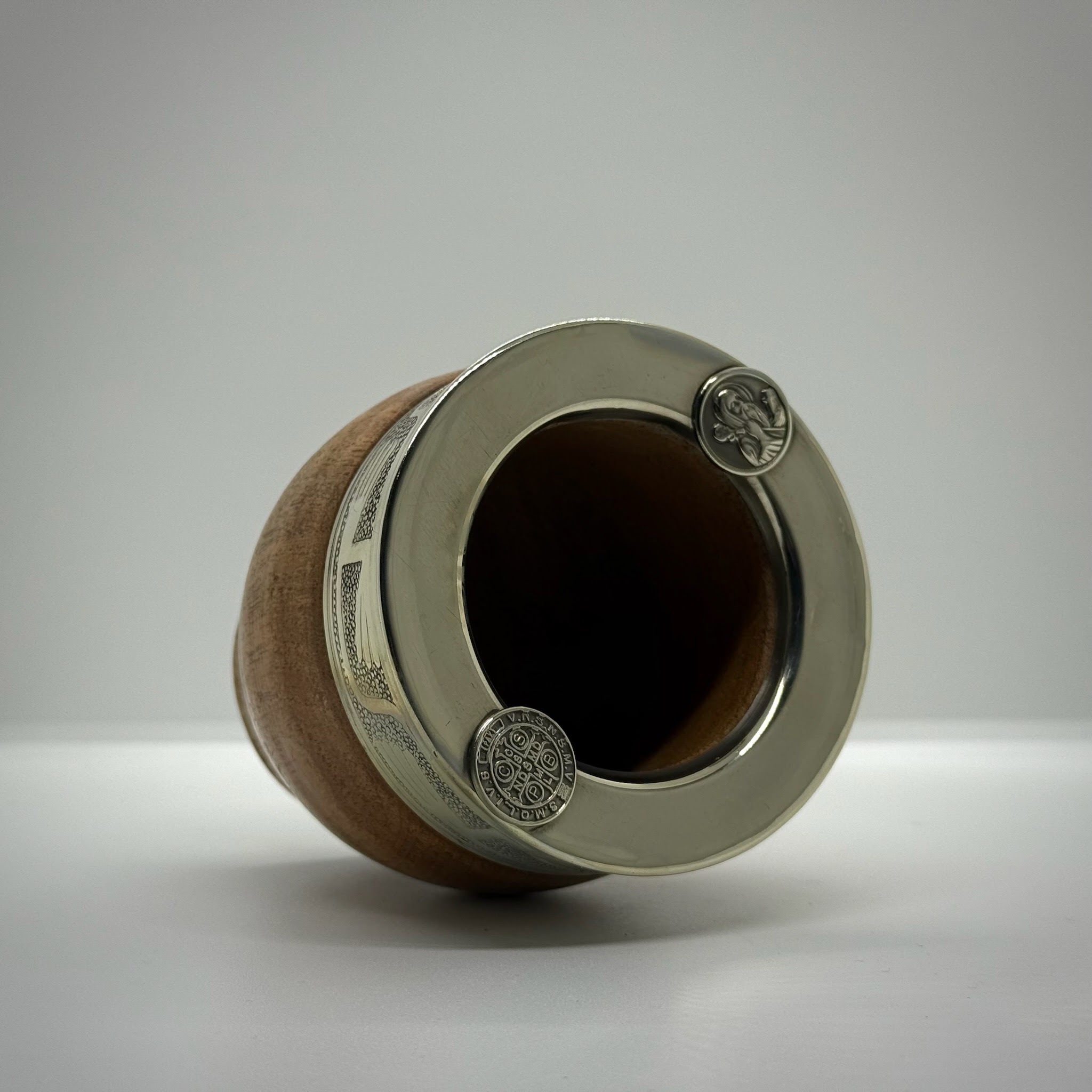 Mate elaborado en madera con detalles en alpaca, que le aportan un estilo tradicional y elegante. Incluye la medalla de San Benito, sumando un significado especial.