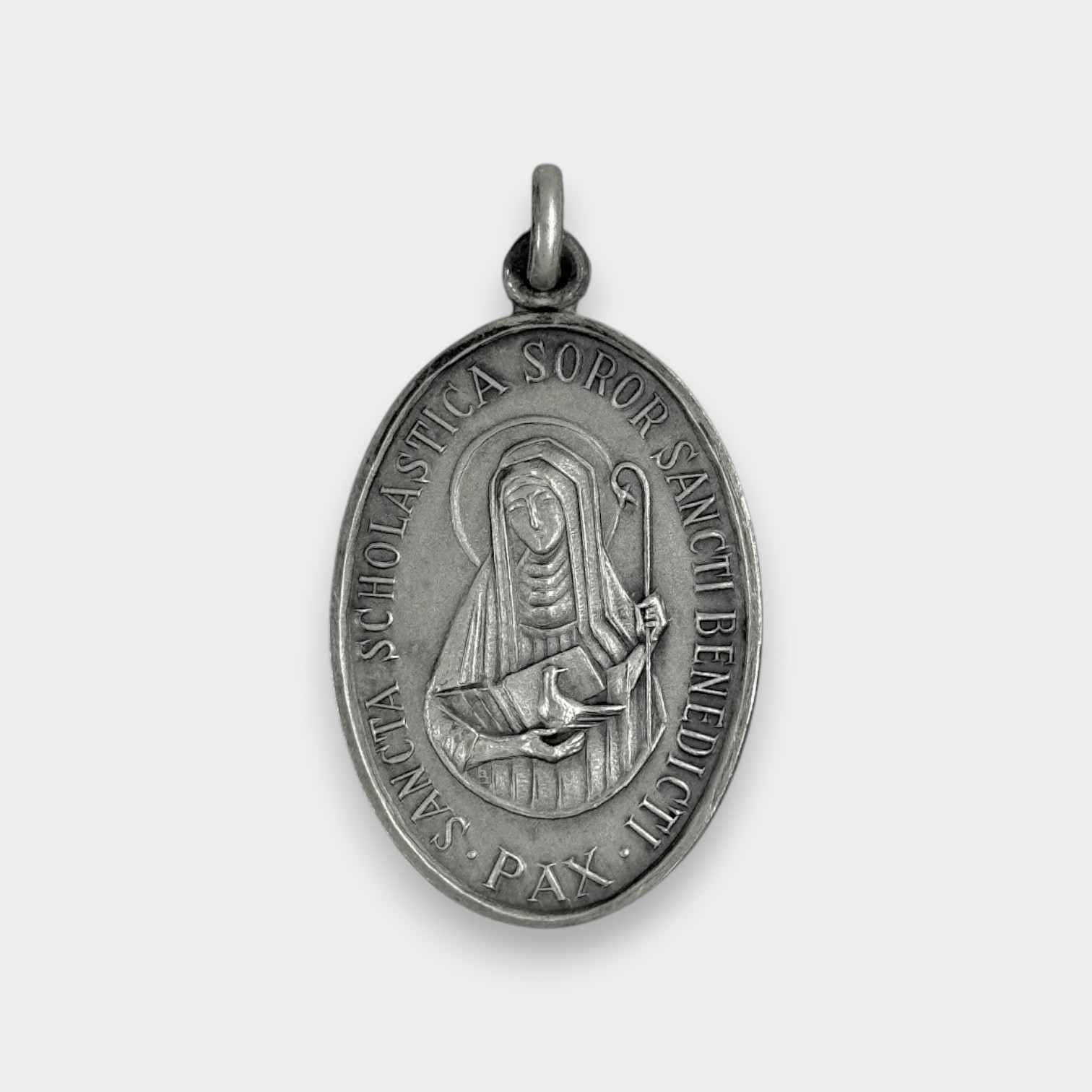 Santa Escolástica de Nursia hermana gemela de San Benito de Nursia y considerada la fundadora de la rama femenina de la Orden Benedictina. Medalla elaborada en plata 925.