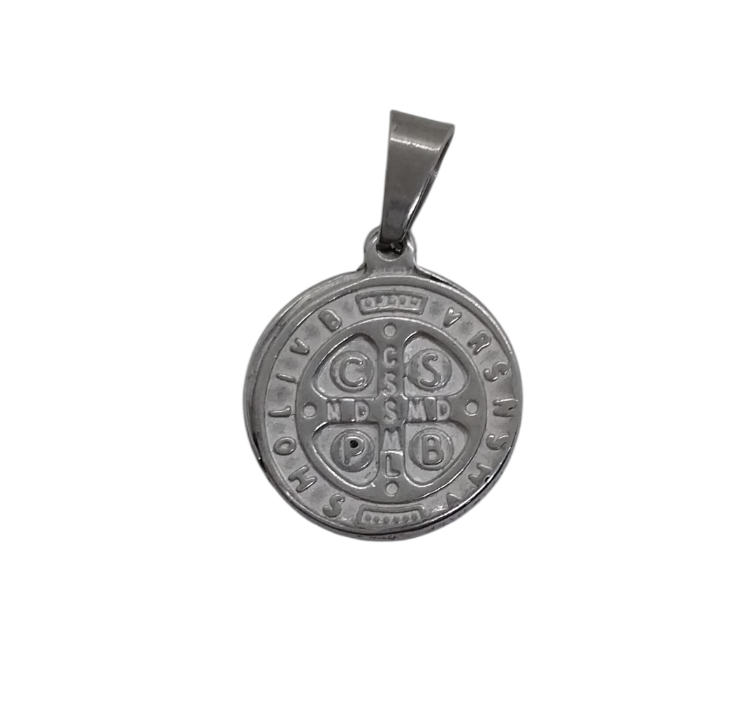 Medalla en acero quirúrgico de 15mm para protección personal. Presenta la Cruz e imágen del santo.