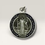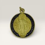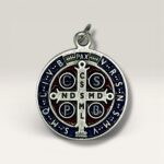 La medalla de San Benito, símbolo tradicional de protección, se integra armoniosamente al diseño, convirtiéndola en un accesorio ideal para uso diario o para regalar en ocasiones especiales.