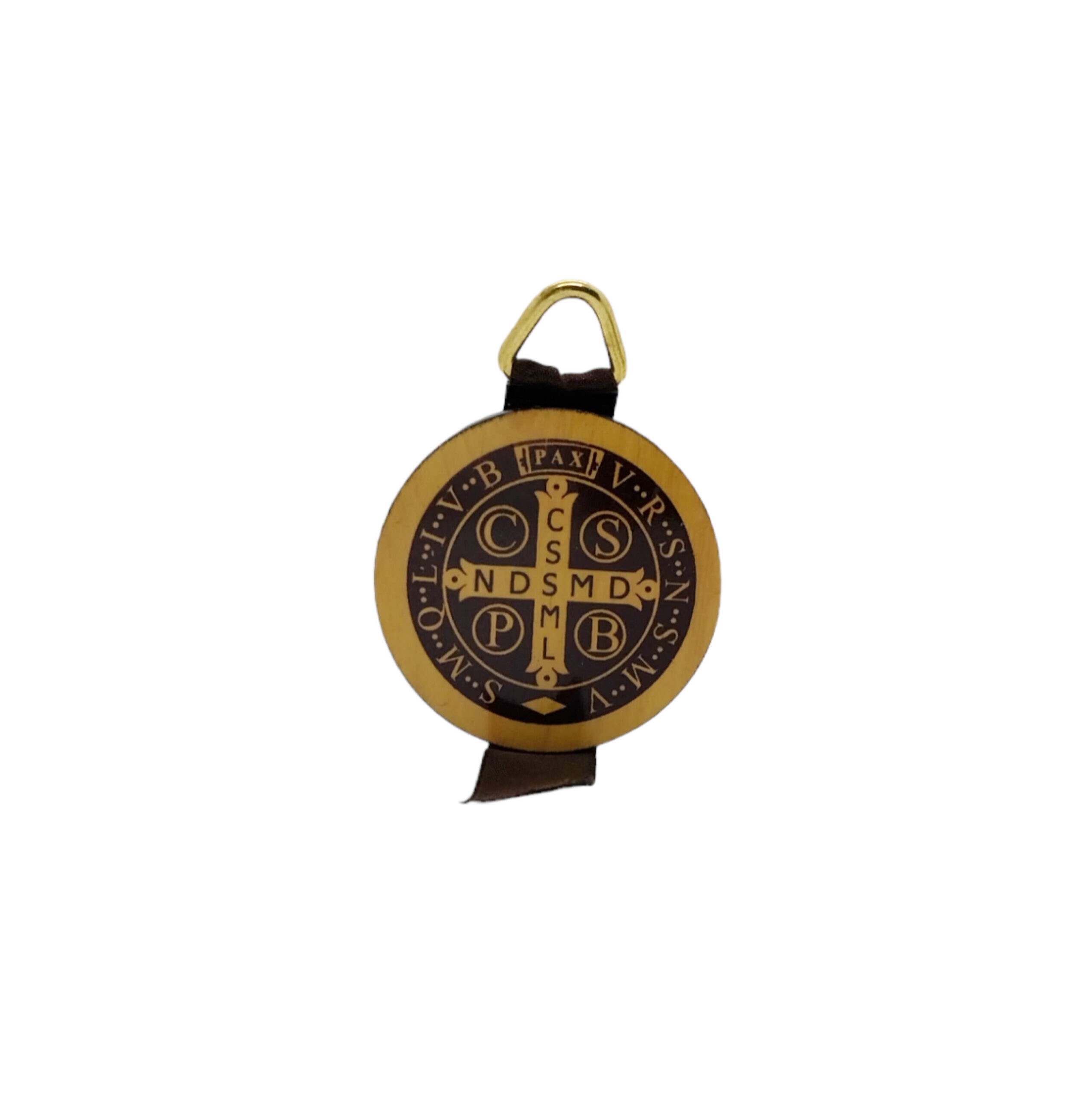 Medalla de San Benito en madera, con diseño tradicional y cinta para colgar. Presenta en su frente la reconocida cruz y las inscripciones protectoras propias de la medalla benedictina. Muy utilizada en hogares y negocios.