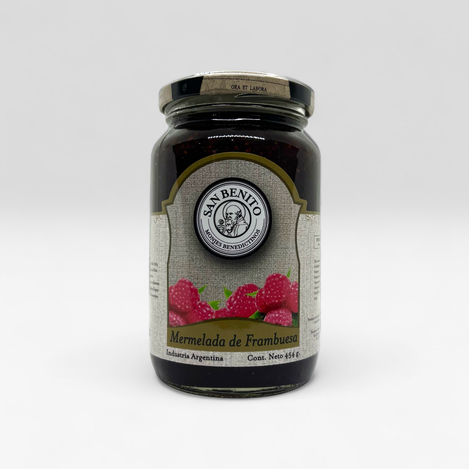 Mermelada natural, con trozos de frambuesa, elaborada por los monjes Benedictinos de la abadía de San Benito de Luján mediante un proceso artesanal.