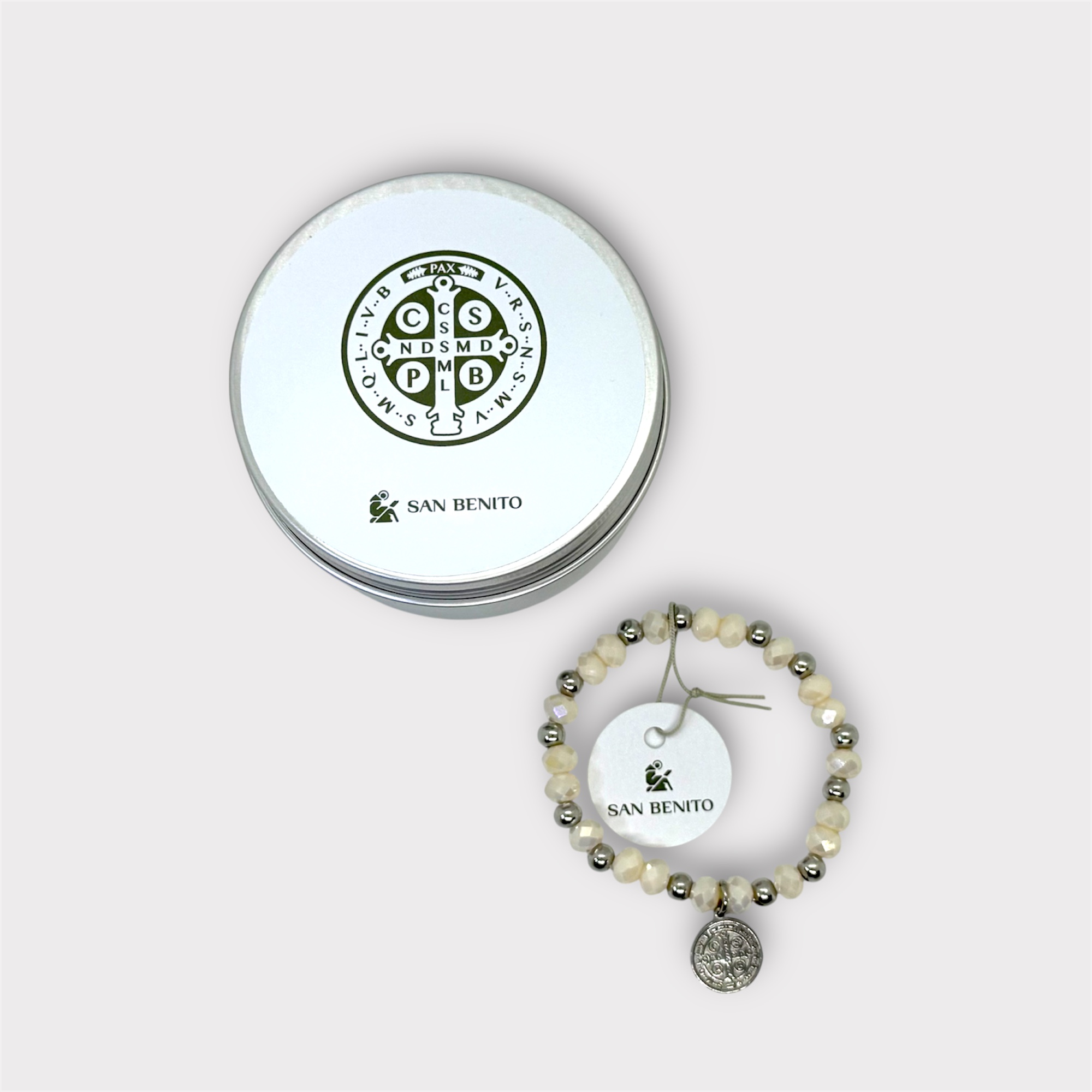 La medalla de San Benito, símbolo tradicional de protección, se integra armoniosamente al diseño, convirtiéndola en un accesorio ideal para uso diario o para regalar en ocasiones especiales.