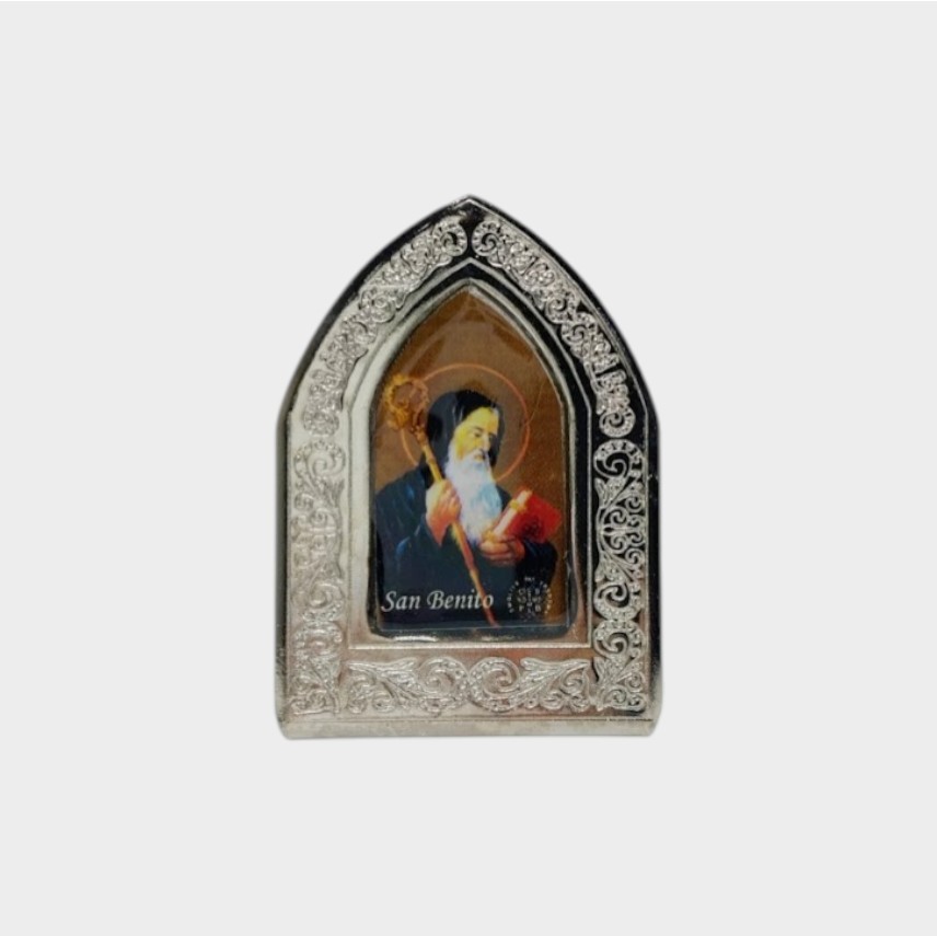 Repisero formato Capilla con la imagen de San Benito, ideal para colocar en mesas de luz, escritorios o pequeños altares. Cuenta con un delicado marco en tono plateado que realzan la imagen del santo.