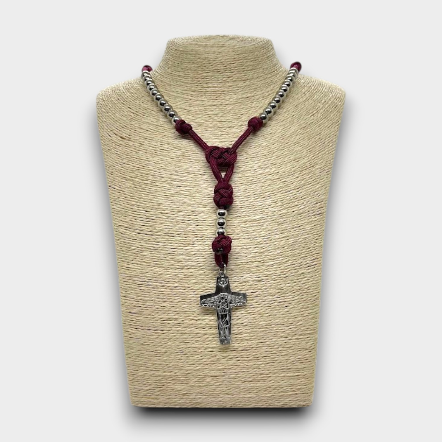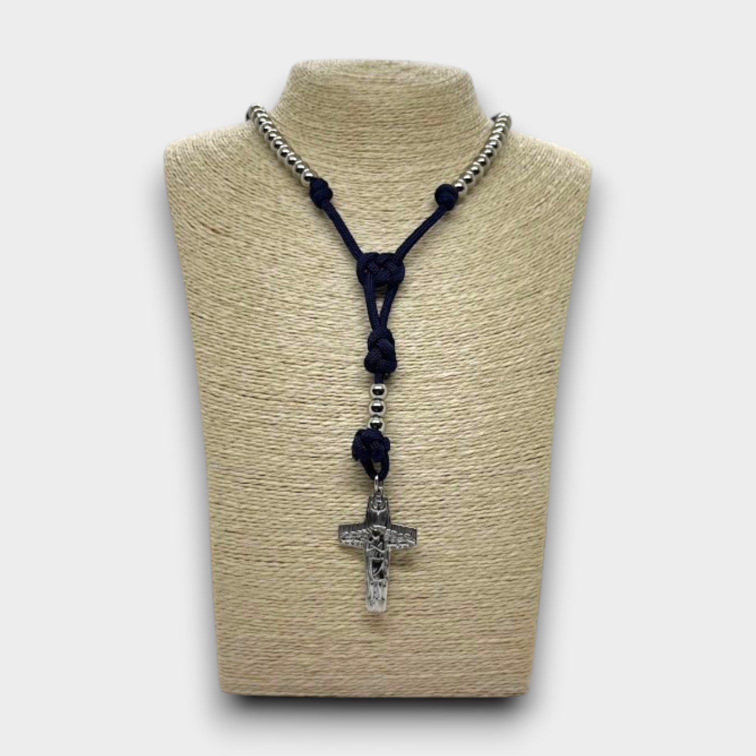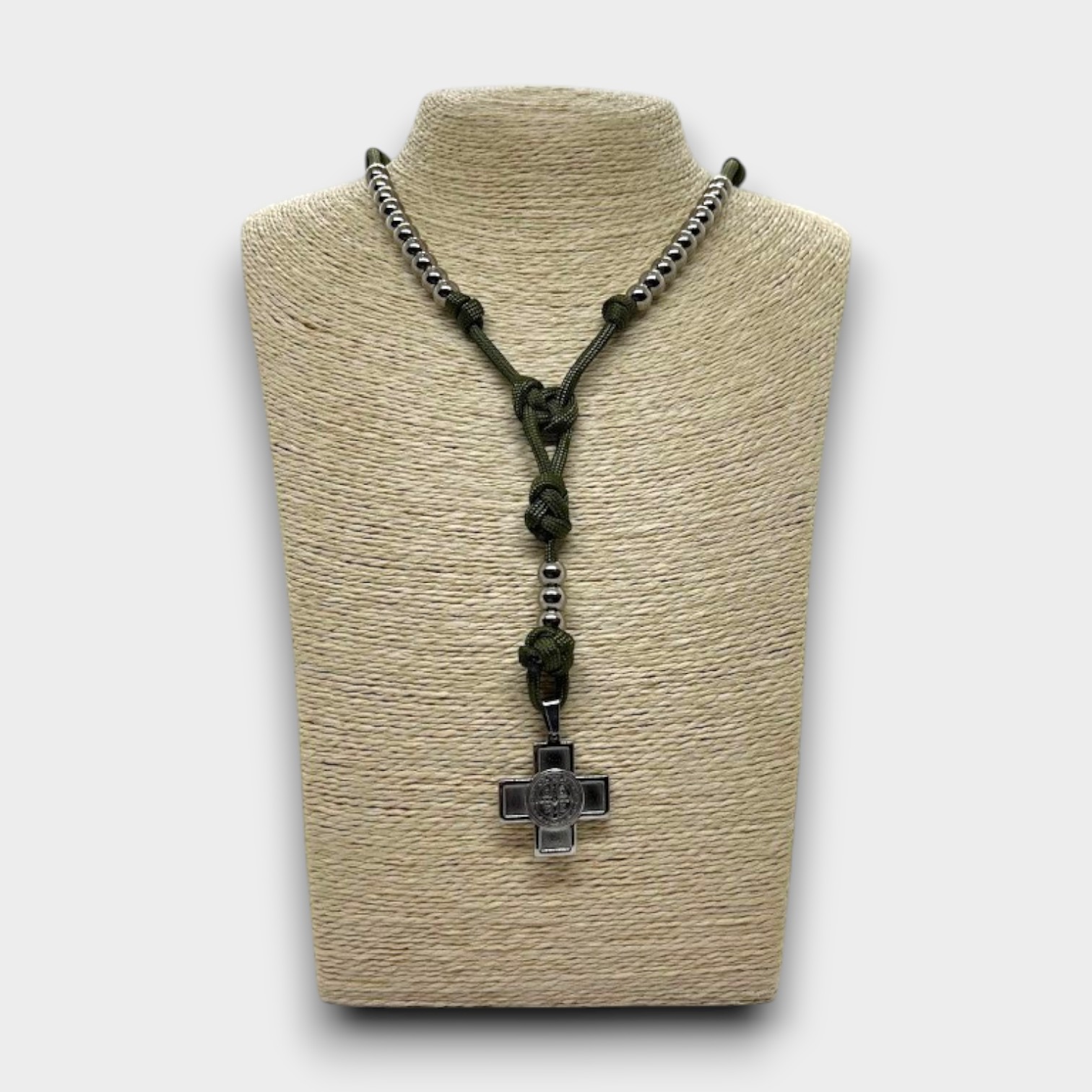Elaborado con cuerda paracord (paracaídas), reconocida por su gran resistencia: soporta el agua, el uso diario intenso y no se rompe fácilmente. Cruz y cuentas en acero quirúrgico, con excelente terminación y detalles bien definidos.