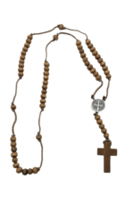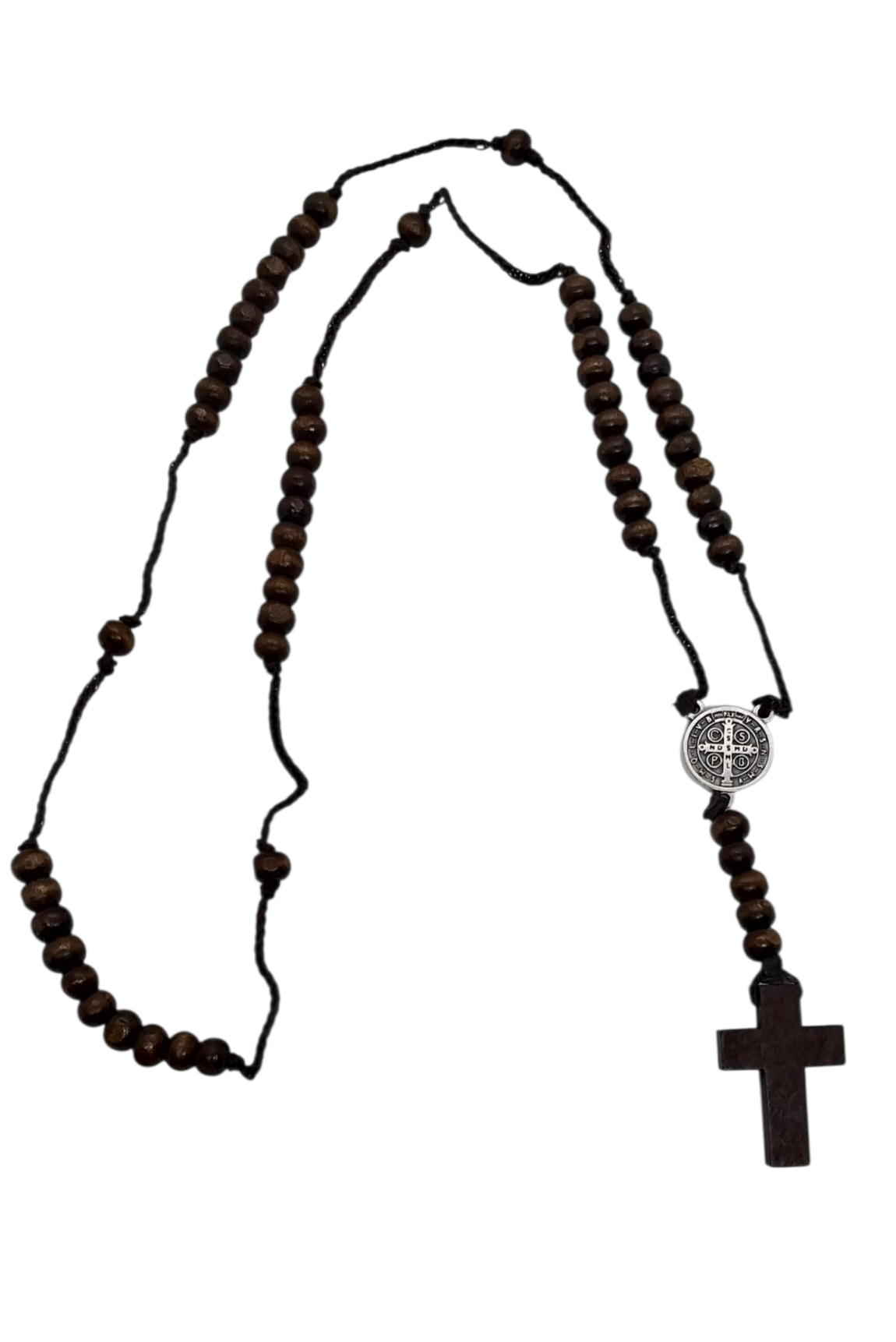 Rosario confeccionado con cuentas de madera natural y cordón resistente, Incluye Medalla de San Benito y cruz de madera a tono, logrando una presentación sencilla y significativa.