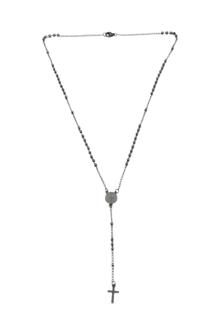 Incluye medalla de San Benito con la tradicional cruz y simbología característica, además de cruz colgante a tono, formando un diseño sobrio y significativo.