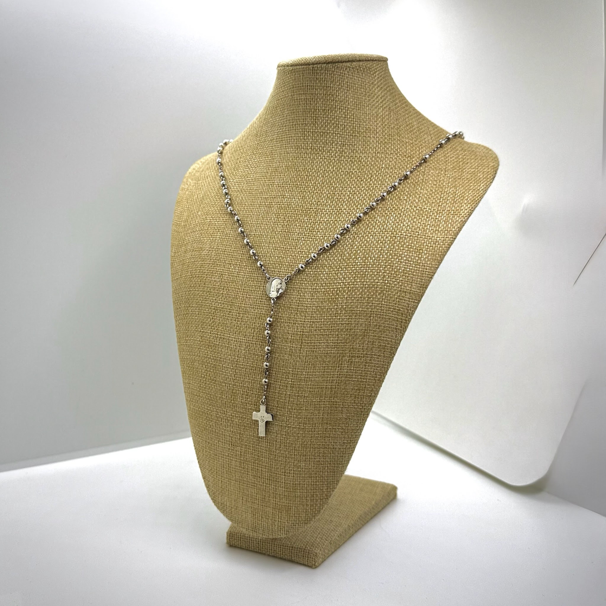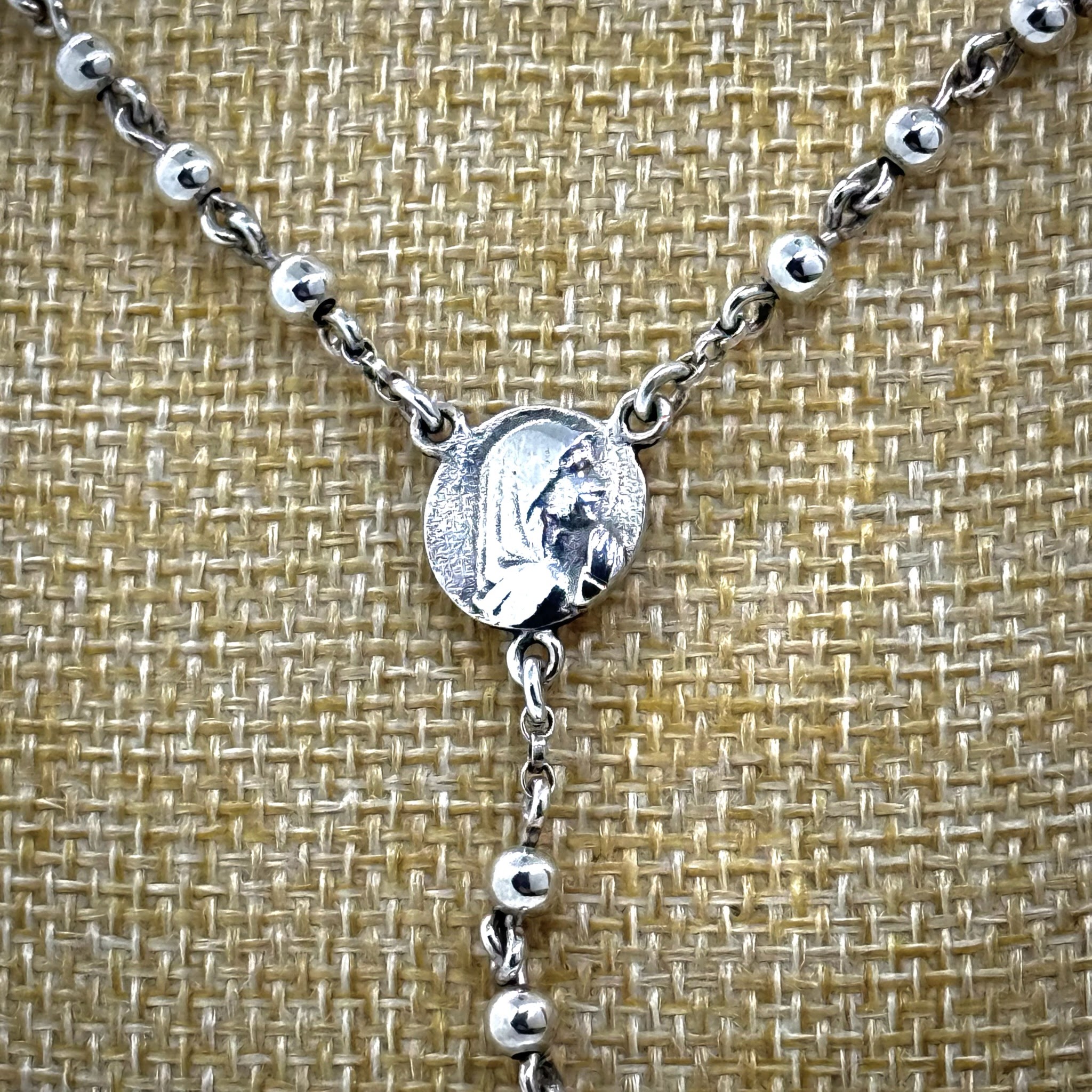 Este delicado rosario está elaborado íntegramente en plata 925, con cuentas de brillo sutil y una estructura resistente que asegura la durabilidad de una pieza calidad. El diseño se destaca por su centro con la medalla de la Virgen Niña y una cruz, es un objeto de devoción ideal para la oración diaria o para ser entregado como un regalo inolvidable en bautismos, primeras comuniones o nacimientos.