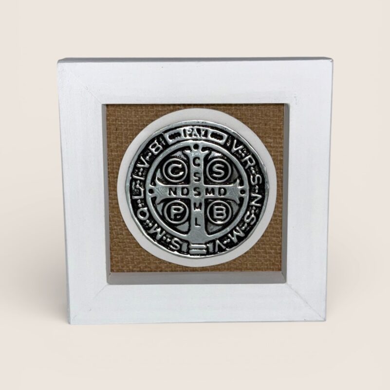Medallón decorativo confeccionado en madera pintada a mano, con detalle central en aluminio repujado con la tradicional imagen de la Medalla de San Benito.
